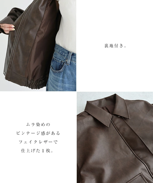 程よいオーバーサイズがこなれた印象の、 フェイクレザー・ブルゾンが入荷しました。 ムラ染めのビンテージ感がある フェイクレザーで仕上げた1枚。 襟元はステンカラーでトレンドライクに、 袖口のタックや、後ろ裾のゴムギャザーで ニュアンスのあるボリュームシルエットが完成。 大きめのサイドポケットもデザインポイントに◎ 季節の変わり目に重宝する 今シーズンのおすすめアウターです! ※裏地あり ※発送上の状態によって商品がシワになる場合がございます。予めご了承くださいませ。 |
