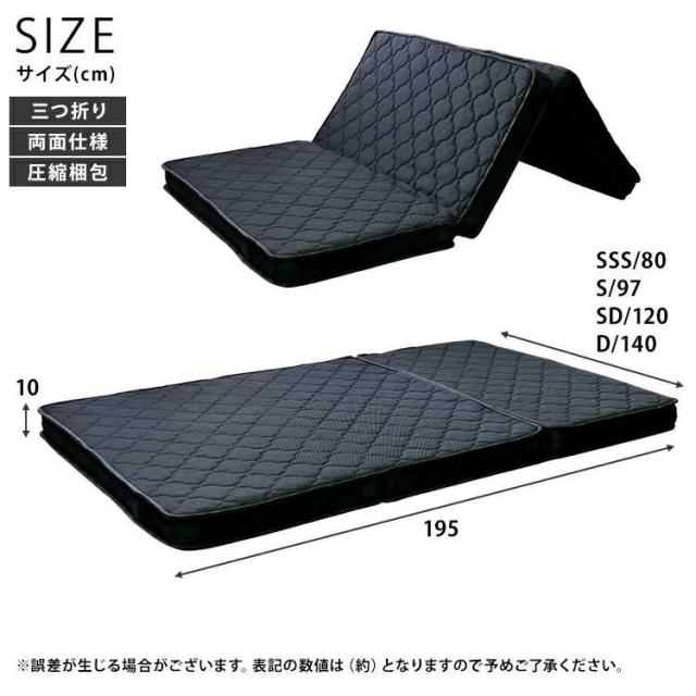 マットレス 折りたたみ 黒 ブラック おしゃれ メッシュ ポケット ブラック色 三つ折りポケットコイルマットレス 厚み10cm ダブル 幅140