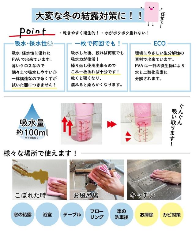 抜群の吸水力で水を一気に吸収し、たれてこないので、窓掃除や洗車後の拭き取り、壁や床の結露、カビ対策にも最適です。
