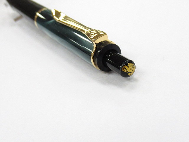 光沢のあるペリカンのくちばしを模ったクリップと樹脂製ブラックボディ、ノックボタンにもペリカンマークが付いた高級感のあるボールペンです