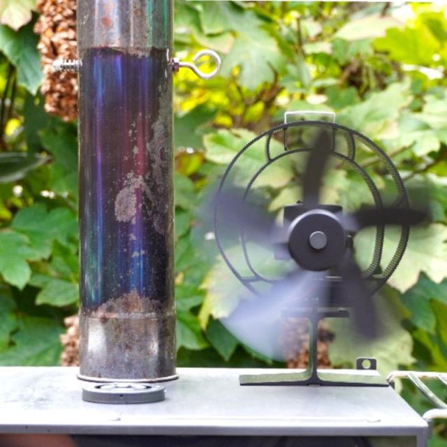 電源不要の薪ストーブの上に置くだけで熱源で作動するサーキュレーター。
