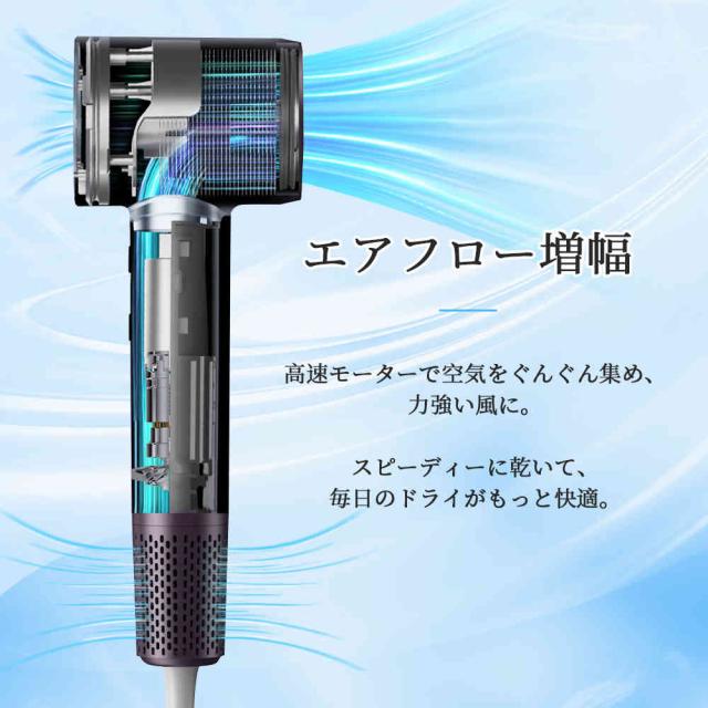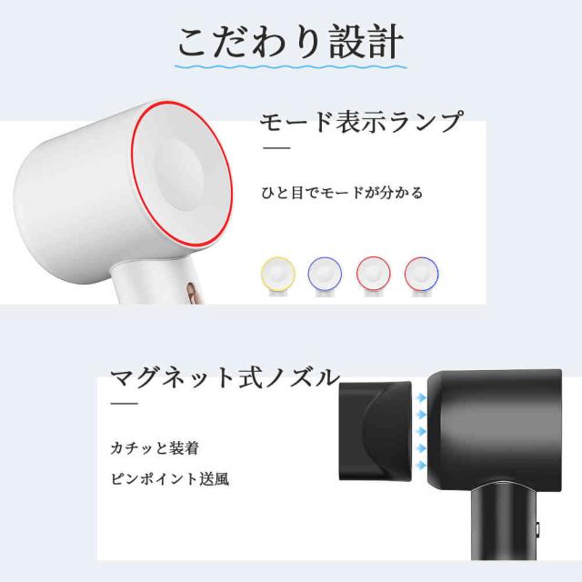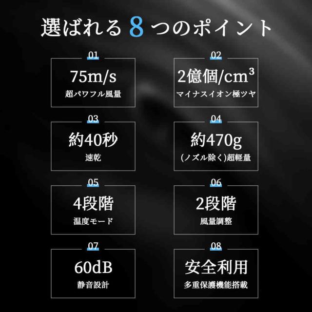 | 【商品特徴】 | 「速さ」と「軽さ」で、朝の時間が変わる。 さらに、本体重量はわずか470g。 「2億個のマイナスイオン」で、ツヤとうるおいを髪の内側へ。 髪質や気分に合わせて選べる「8通りの風」。 快適さを追求した、使いやすい「設計美」。 約60dBの「低騒音設計」で、家族にもやさしい。 |