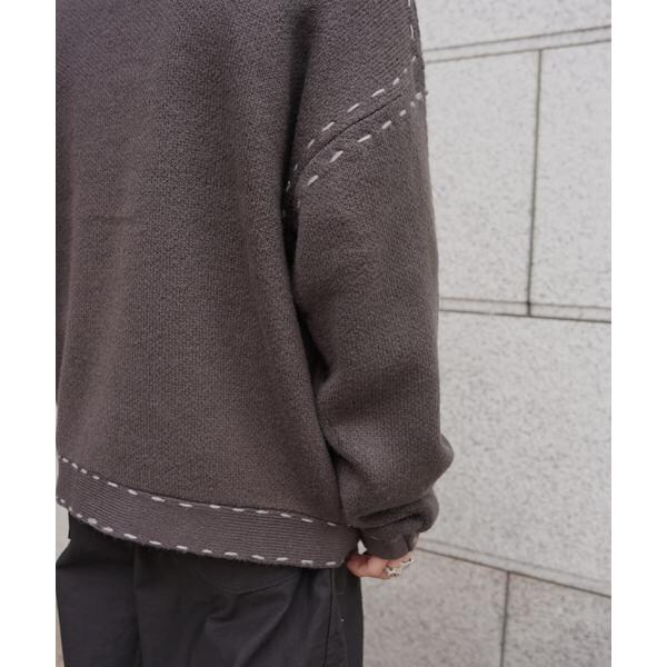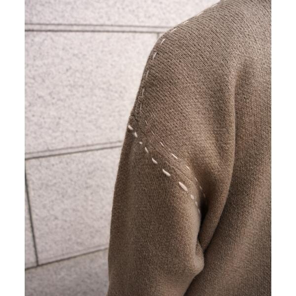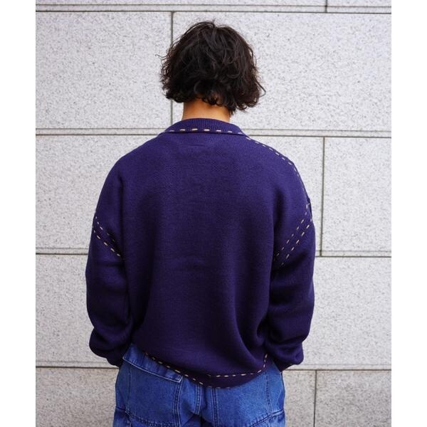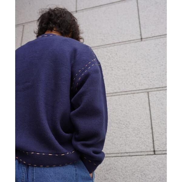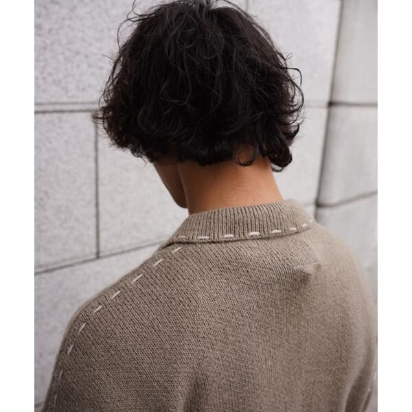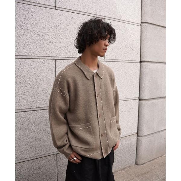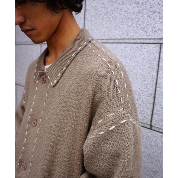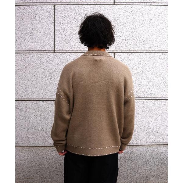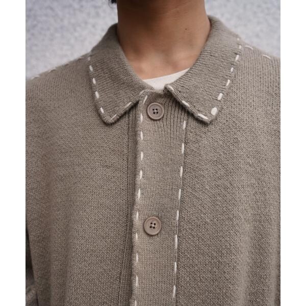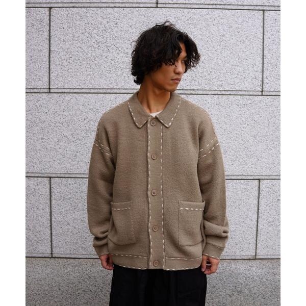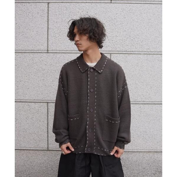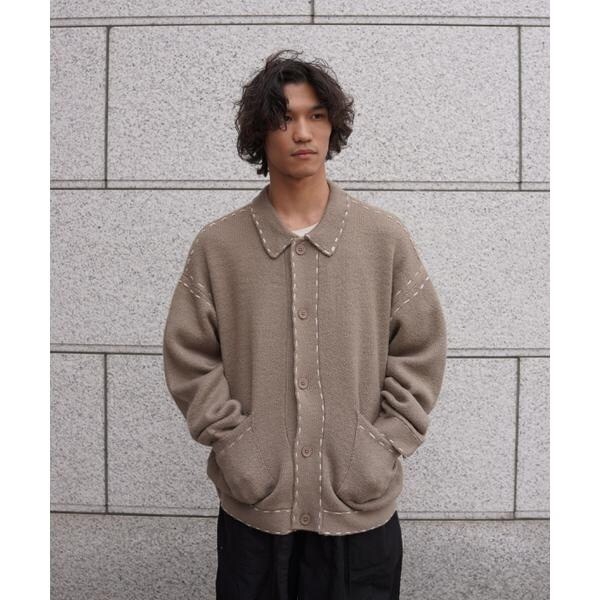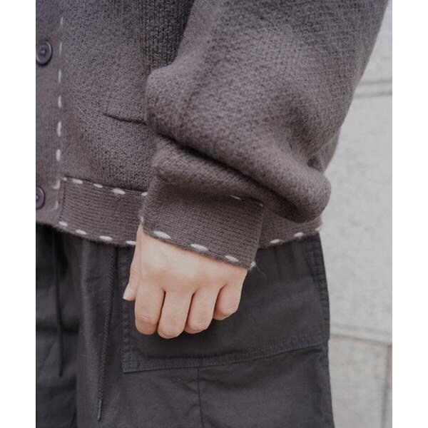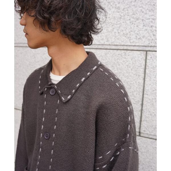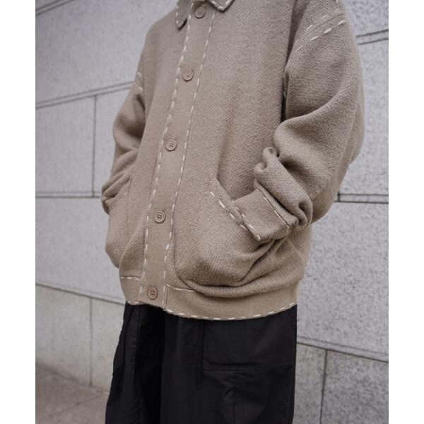 ポケット、エリ、ソデなど各所にステッチを配置したニットジャケット。