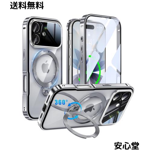 iPhone 17 用 ケース 両面保護 MagSafe対応 光沢CD紋様リング 360°定点回転スタンド 自動ポップアップロック付き カメラレンズフル保護