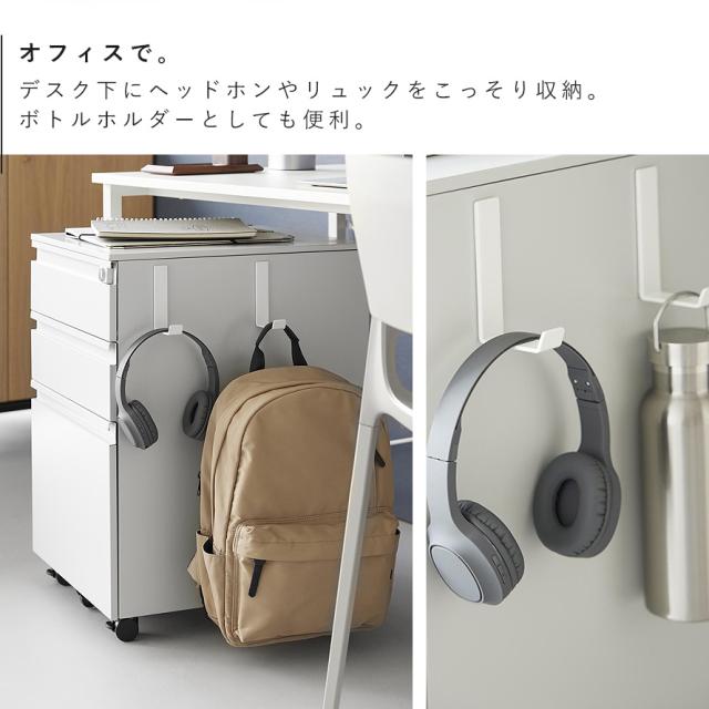 長めのフックなので奥行きのある物も掛けやすく、スチールワゴンに取り付けてヘッドホンや水筒などの収納にもおすすめです。