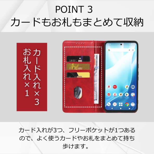 収納:カードポケット×3、紙幣やレシートが入るフリーポケット×1