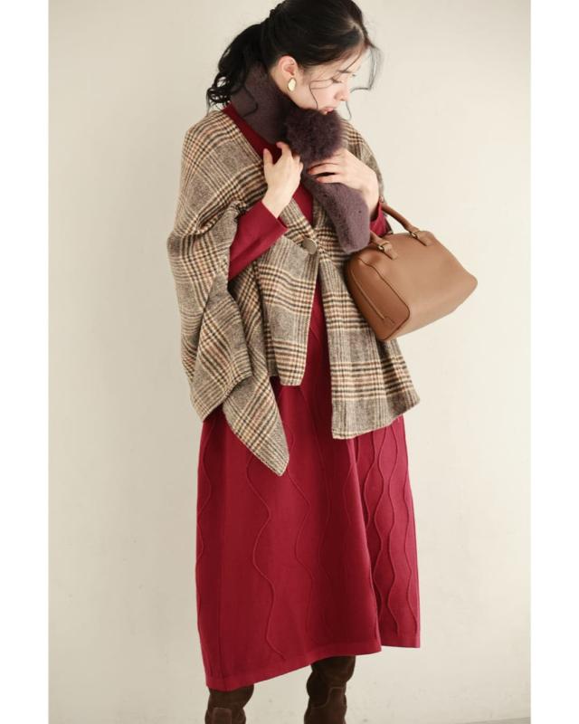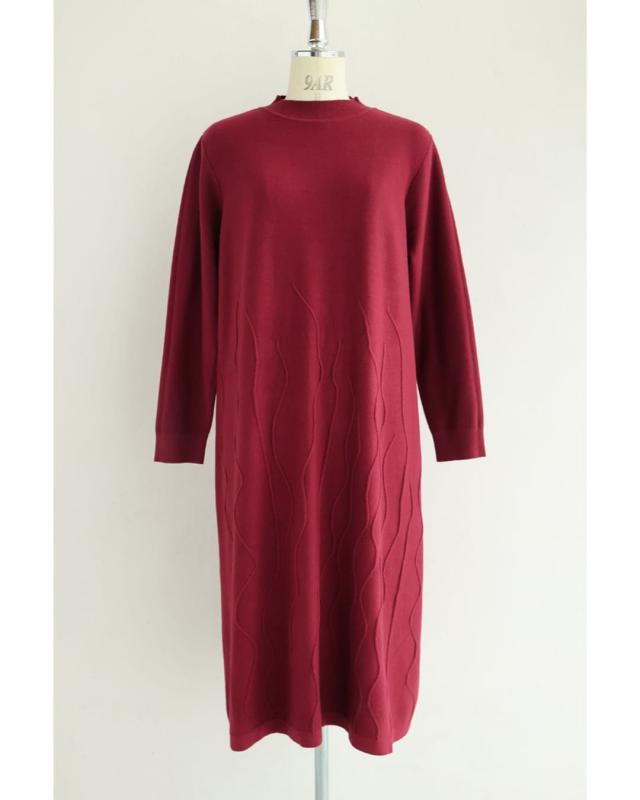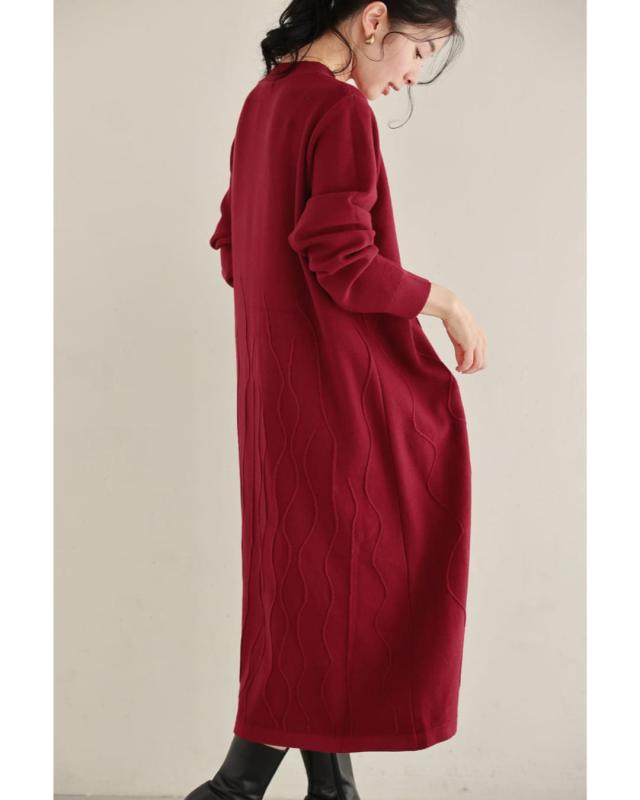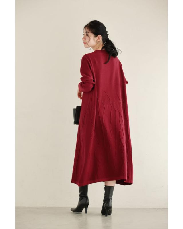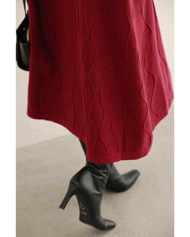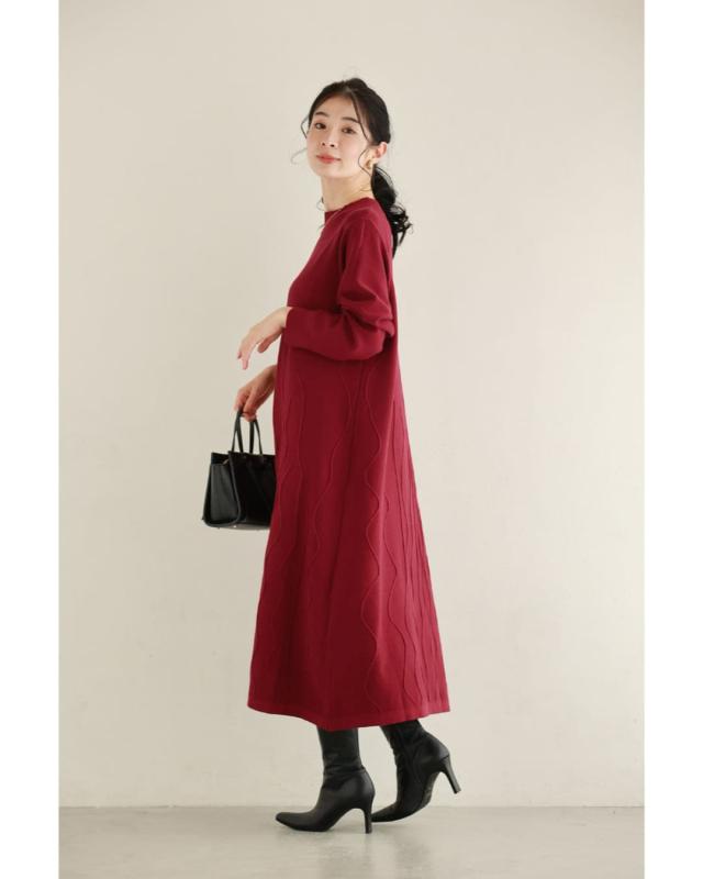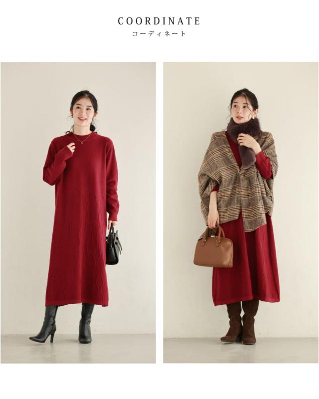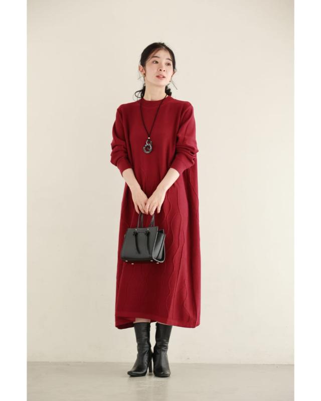 - 明るい赤ではないので、抵抗なく着れちゃいます。少し立体的な模様が動くたび上品な雰囲気を醸し出してくれるニットワンピースです。