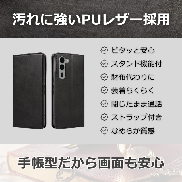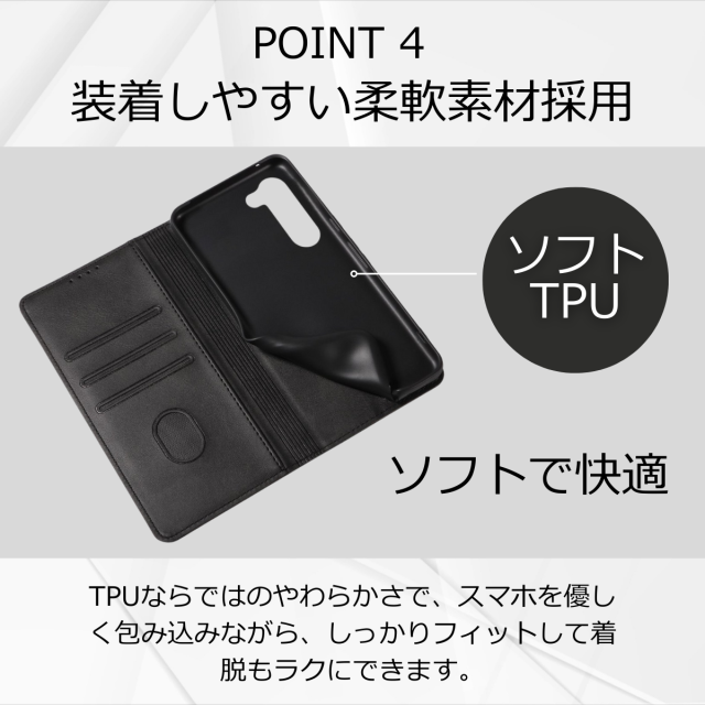 外側は高級感のあるPUレザー、内側は衝撃をやわらげるTPU素材を採用し、大切な端末をしっかり保護します。