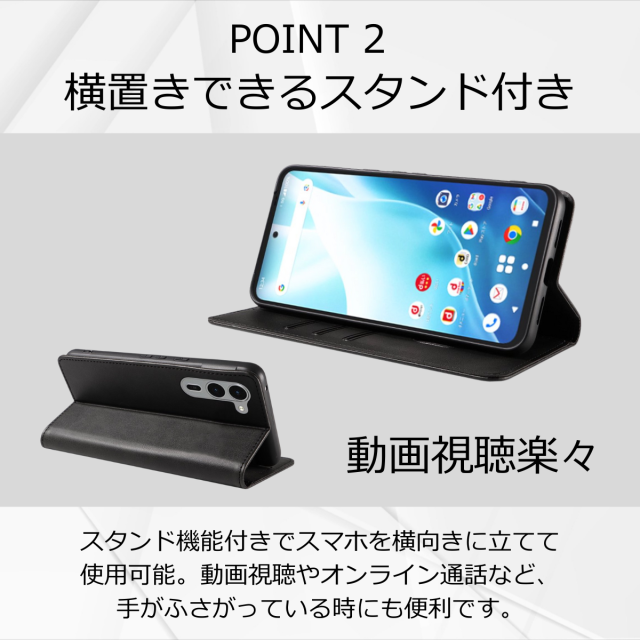 スタンド機能付きで横向きに安定して立てられます。動画視聴や資料確認にも便利な仕様で、日常使いに役立ちます。