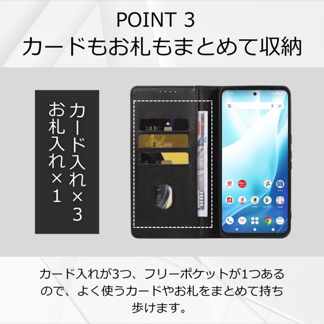 収納:カードポケット×3、紙幣やレシートが入るフリーポケット×1
