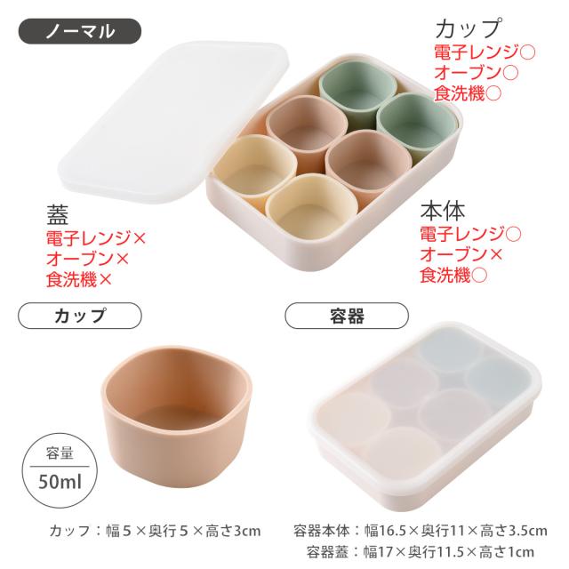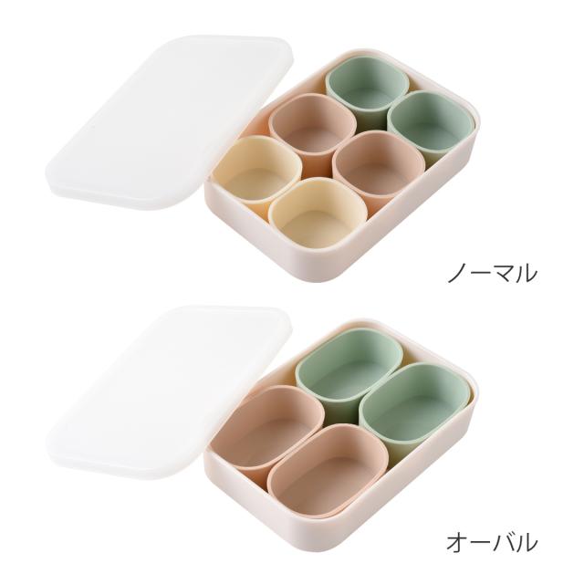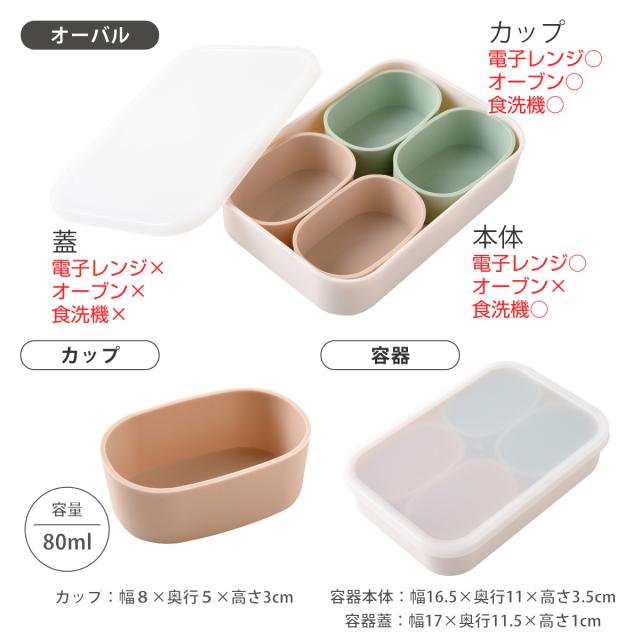 | サイズ | 容器本体:約 幅16.5×奥行11×高さ3.5(cm) 容器蓋:約 幅17×奥行11.5×高さ1(cm) ノーマルカップ:約 幅5×奥行5×高さ3(cm) オーバルカップ:約 幅8×奥行5×高さ3(cm) |