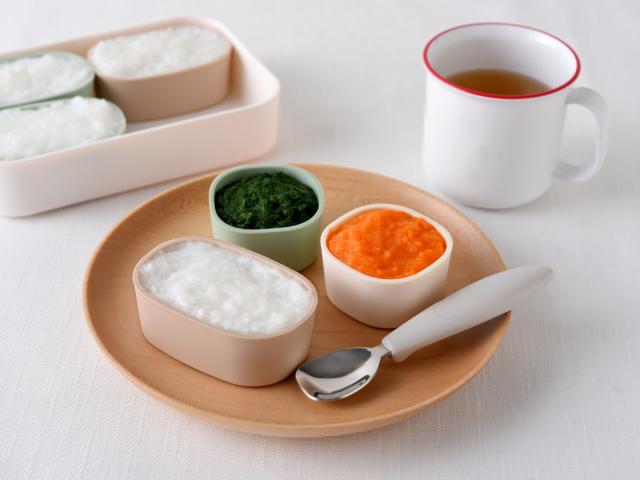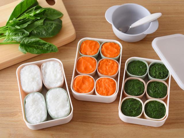 大量に作って冷凍保存できるので、離乳食に大変便利です。使用時にはそのまま移し替えず、器として使うことができます。