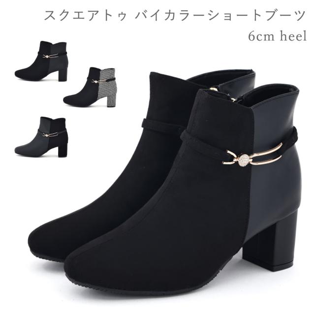 レディース ブーツ スクエアトゥ バイカラーショートブーツ 太ヒール チャンキーヒール サイドファスナー デザインノート Design Note 防滑 ビジュー シンプル きれいめ 6cmヒール 9024