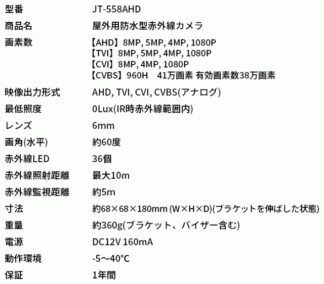 ■ JT-558AHD | 800万画素4K撮影対応 赤外線 4in1バレット型カメラ【JTC】【防犯カメラ】【監視カメラ】【セキュリティーカメラ】