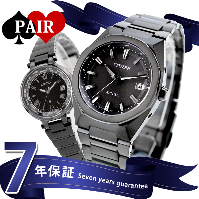 正規品 7年保証キャンペーン 送料無料 ペアウォッチ シチズン アテッサ クロスシー 日本製 メンズ レディース 腕時計 pir-citizen117 CITIZEN TTES xC アナログ ブラック ◆洗練されたブラックで揃える大人のペアスタイル。メンズはチタニウムを採用した「CITIZEN TTES(アテッサ)」の3針モデル。八角形ベゼルと立体的な文字盤が力強く、スポーティかつ上質な印象を演出します。レディースは「CITIZEN xC(クロスシー)」の限定オールブラックモデル。ストライプとラメが織りなす華やかな文字盤に、TOKYO位置のゴールドハートがさりげなく輝きます。記念日や誕生日のギフトにもおすすめの組み合わせです。 【レディース】数量限定モデル1000個 メンズ品番:CB3045-61E レディース品番:EC1016-51E