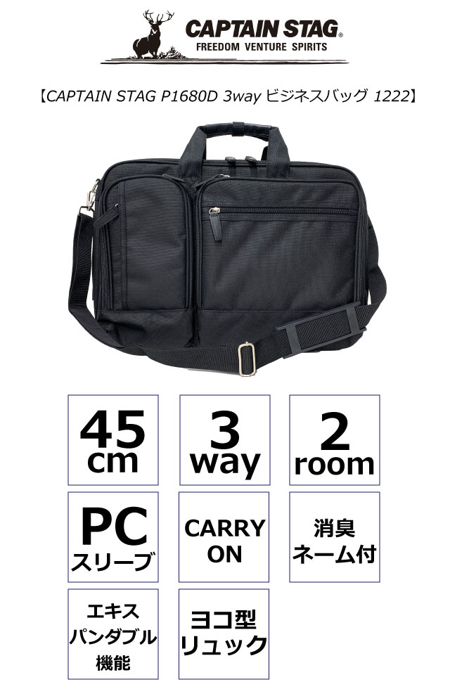 ![]() ![]() ![]() ![]() ![]() ![]() ![]() ![]() ![]() ・CAPTAIN STAG キャプテンスタッグ 通勤や営業に最適な機能性を備えています。 45cmの大容量で、ノートPCや書類をしっかり収納可能。エキスパンダブル機能により、荷物が増えても安心です。 ショルダー、リュック、手提げとして使用できる3way仕様で、様々なシーンに対応。 さらに、消臭ネームが施されており、常に清潔に保てます。 ビジネスシーンでの信頼できるパートナーとしておすすめです。