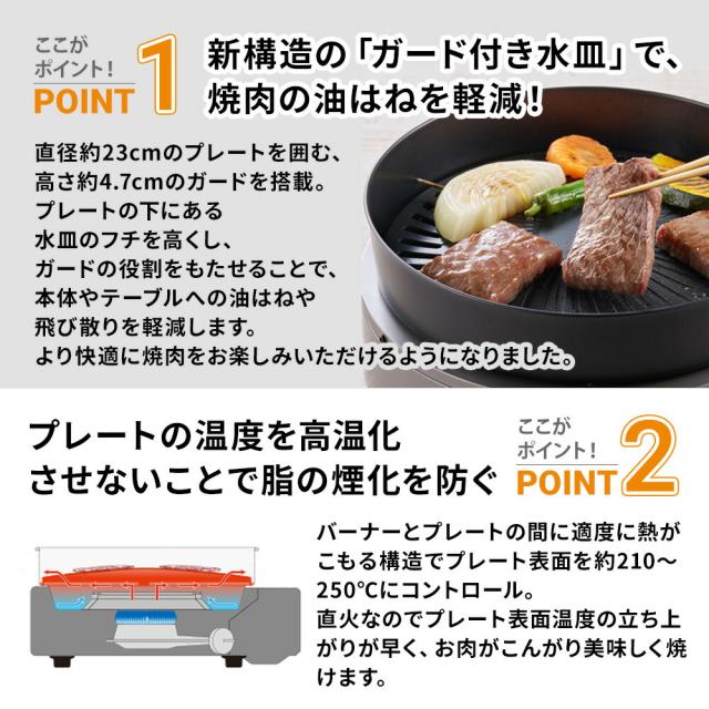材質 | 本体/鋼板(粉体塗装) プレート/アルミダイカスト(フッ素樹脂加工) 水皿/鋼板(耐熱塗装) バーナー/耐熱アルミダイカスト 点火つまみ/ABS樹脂 |