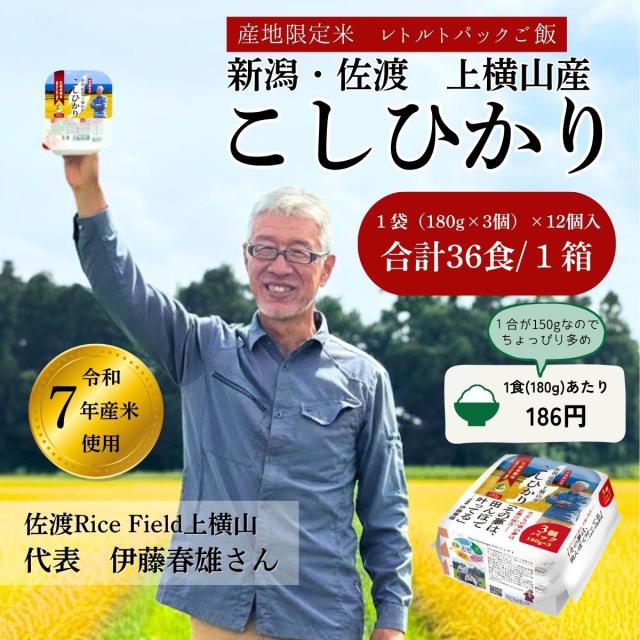 【令和7年産】新潟・佐渡上横山産 こしひかりパックご飯(180g×3個)×12計36食/箱 <1食あたり186円><ちょっぴり多めの1個180g>送料無料【沖縄のみ送料2200円】