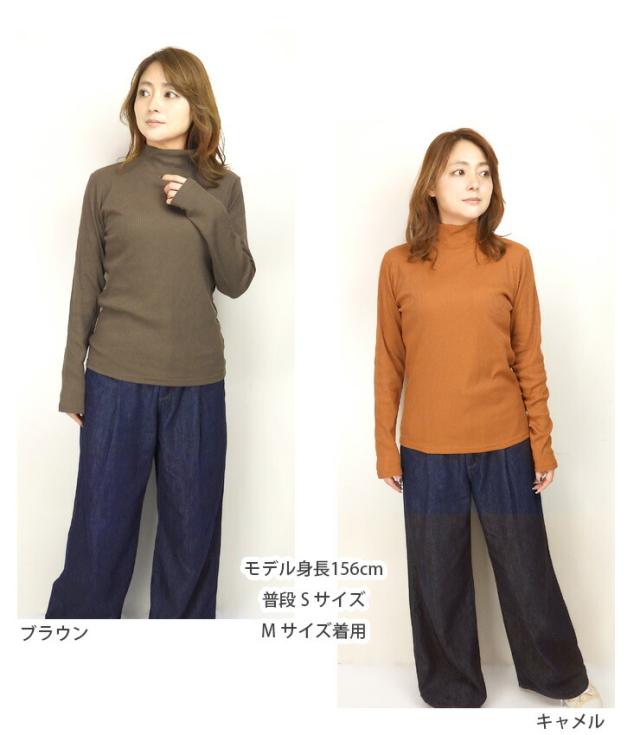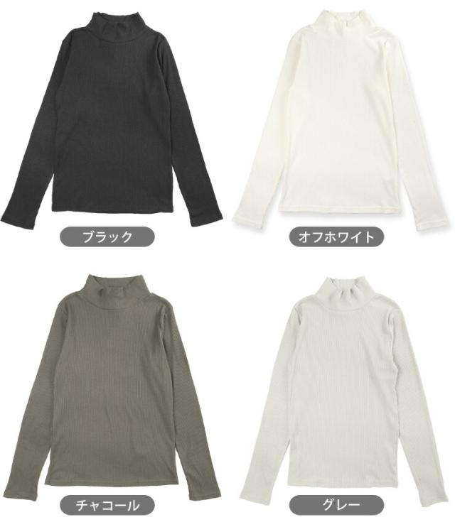 ハイネック 長袖 リブ カットソー レディース 春秋 M L 51695A ブラック オフホワイト チャコール グレー ブラウン モカ キャメル 無地 モックネック トップス ロンT トップス インナー 黒 白 茶 メール便送料無料 3034