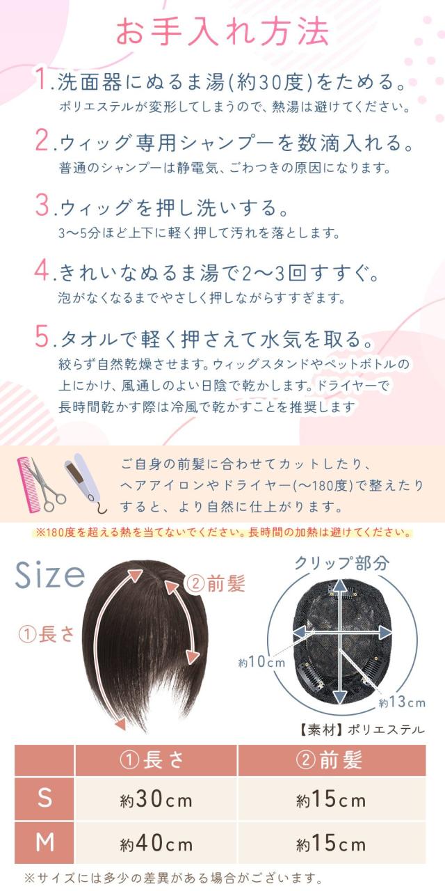 お手入れは手洗いが簡単:ぬるま湯にウィッグ専用シャンプー→押し洗い→すすぎ→タオルドライ→自然乾燥。
