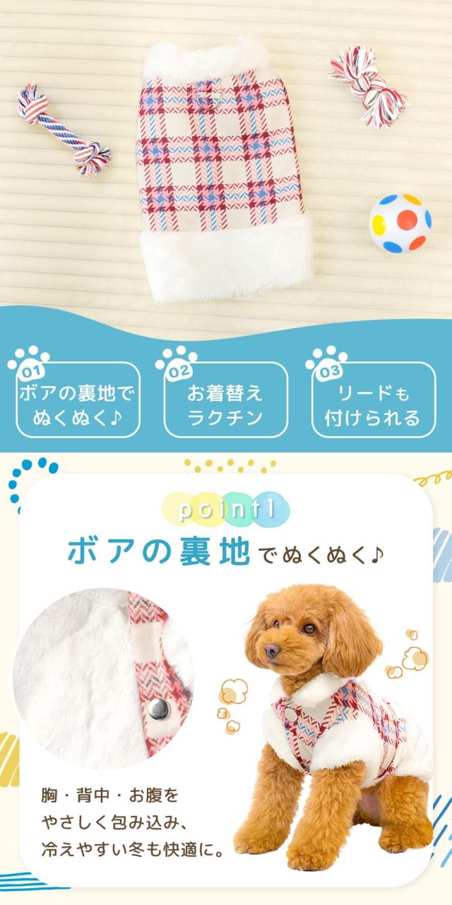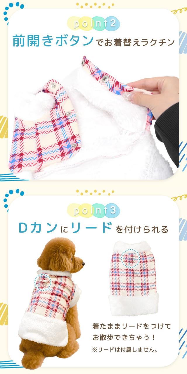 もこもこ/犬用/ベスト/犬服/ドッグウェア/ペット服/ファーベスト/裏ボア/ふわふわ/あったか/保温/防寒/秋冬/チェック柄/袖なし/軽量/動きやすい/前開き/スナップボタン/着脱簡単/Dカン付き/リード・ハーネス対応/お散歩/おでかけ/小型犬/中型犬/ストレッチ/ポリエステル/洗濯OK/お手入れ簡単/サイズ展開/ギフト