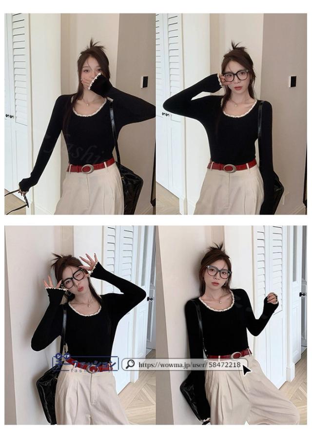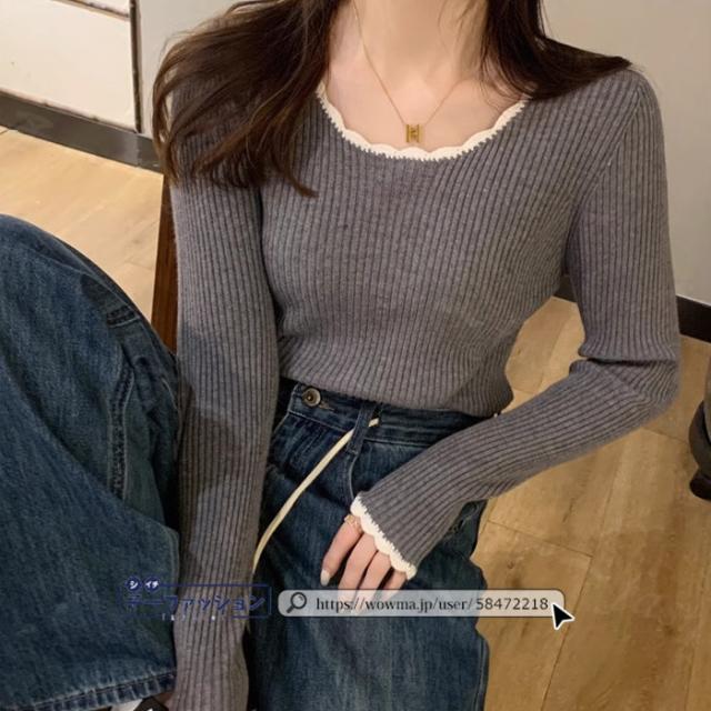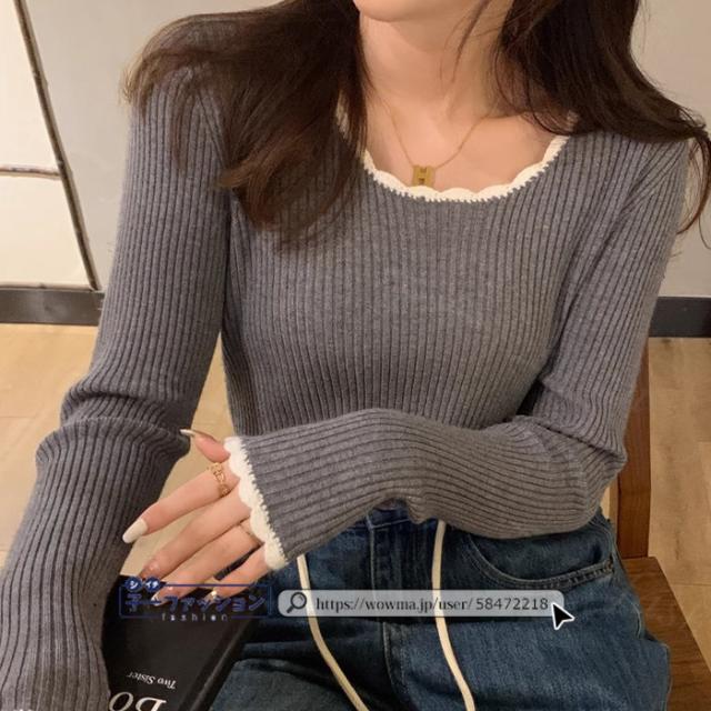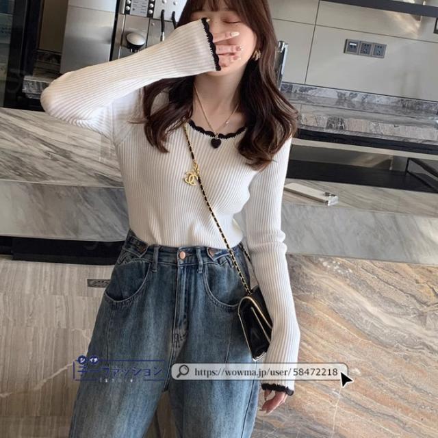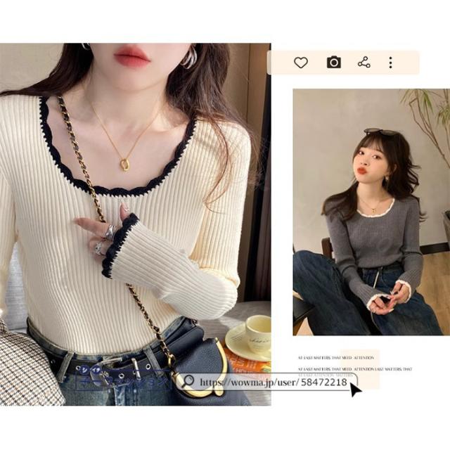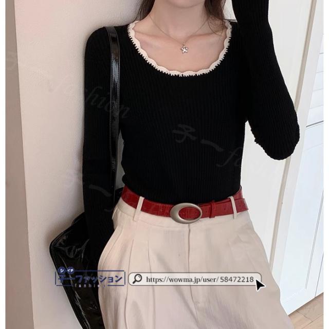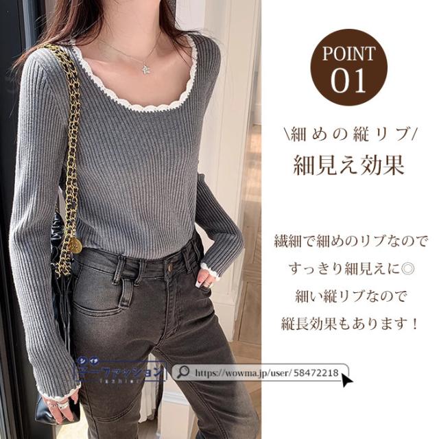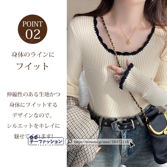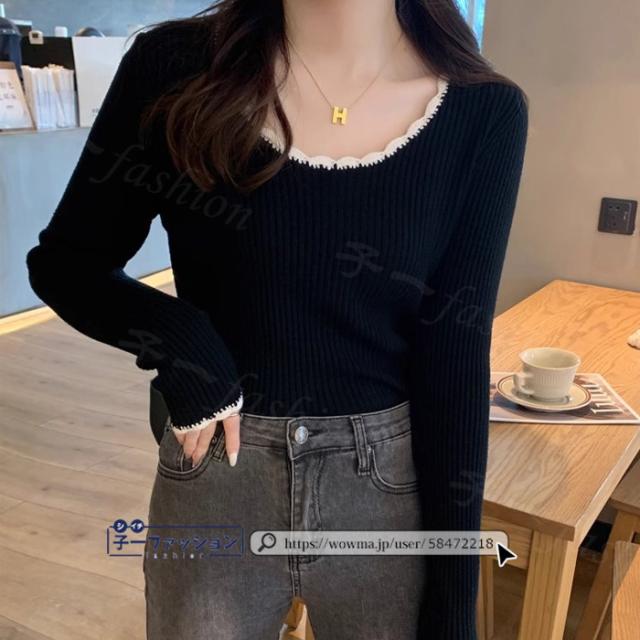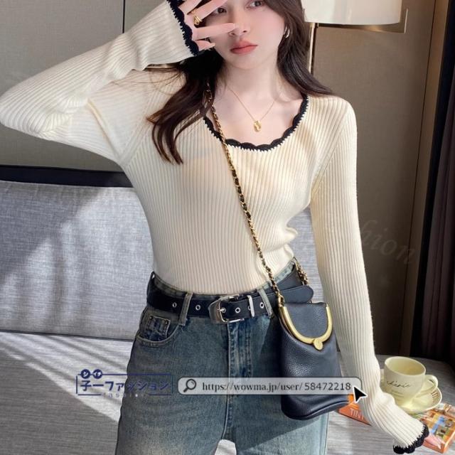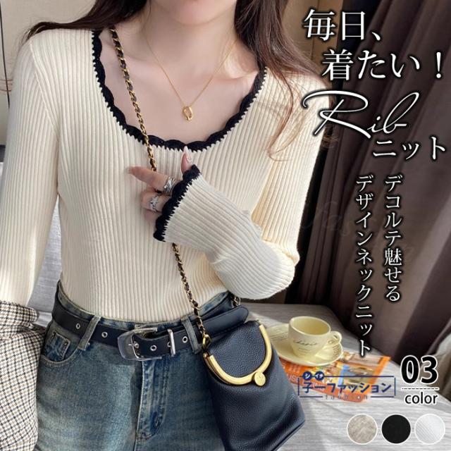 リブニット ニットトップス ニットセーター 長袖 春新作 レディース Uネックニット デザインネックニット 防寒 薄手 無地 重ね着 オフィス 無地 着回し プルオーバー インナー フィット ストレッチ 通勤 通学 秋冬 バレンタイン