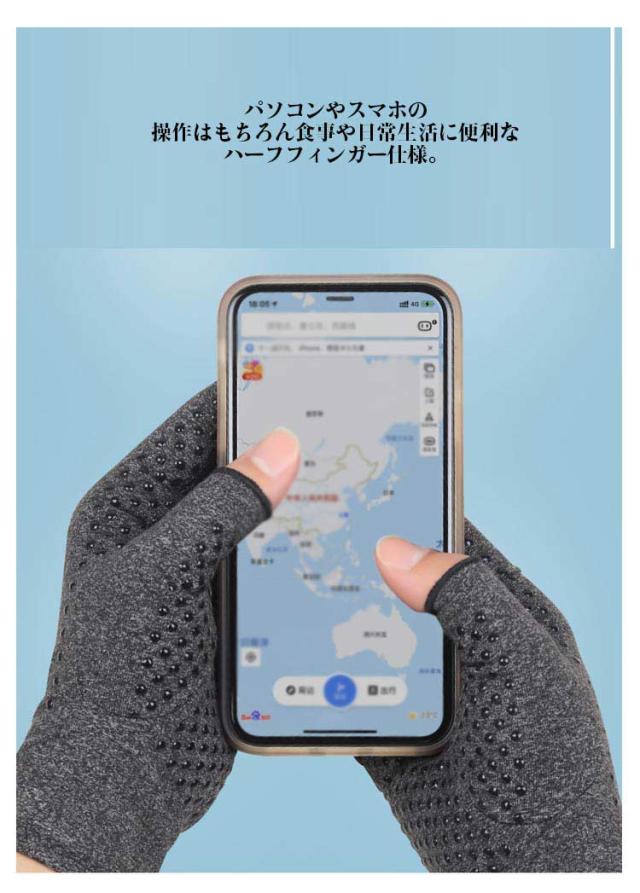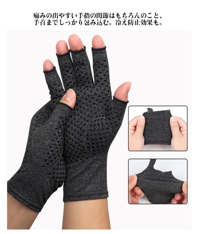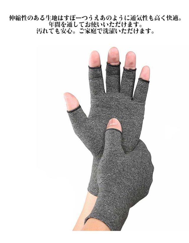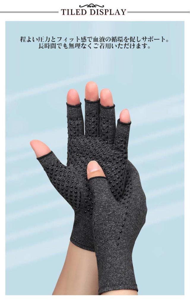 | 関節炎、腱鞘炎などの痛みの軽減に!手指のつらい痛みを着圧手袋がサポート! 程よい圧力とフィット感で血液の循環を促しサポート。長時間でも無理なくご着用いただけます。 パソコンやスマホの操作はもちろん食事や日常生活に便利なハーフフィンガー仕様。 痛みの出やすい手指の関節はもちろんのこと、手首までしっかり包み込む。冷え防止効果も。 伸縮性のある生地はすぽーつうえあのように通気性も高く快適。年間を通してお使いいただけます。 汚れても安心。ご家庭で洗濯いただけます。 | |
