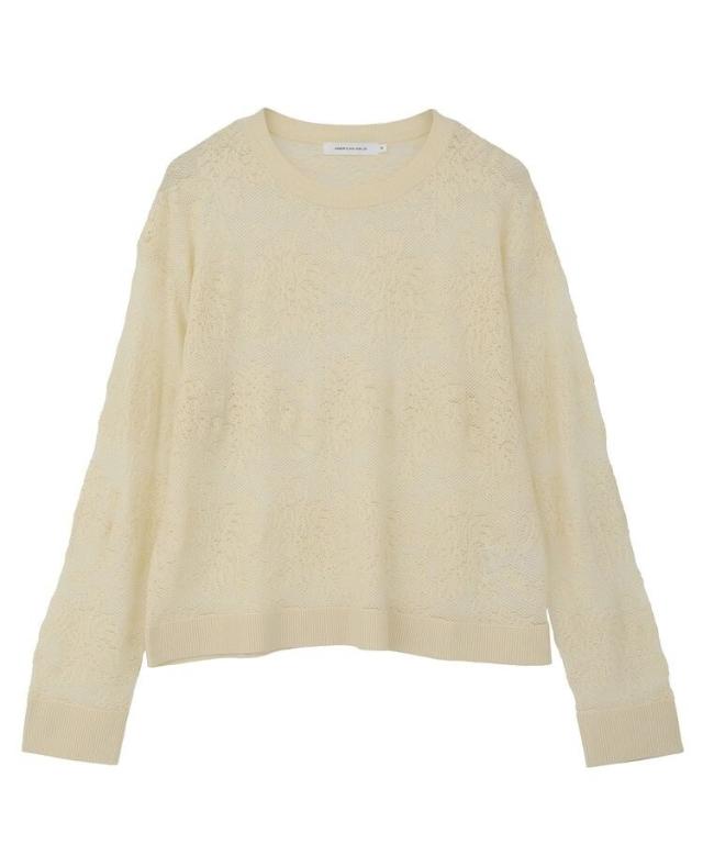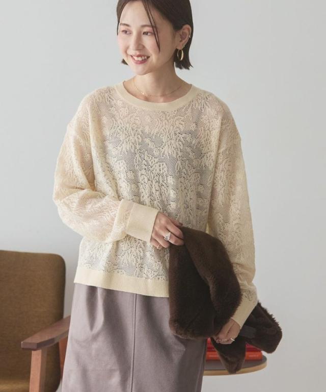 程よくシアーなレース編みが上品な印象のニットプルオーバー。透け感を活かして、色物インナーとのコントラストをお楽しみいただけます。やや短丈の旬フォルムでワイドパンツやボリュームスカートとも好相性。重くなりがちな秋冬スタイルに軽やかな抜け感をプラスしてくれるおすすめのアイテムです。透け感[ややあり]