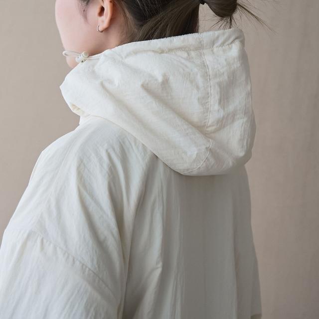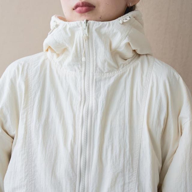 首元まで包む高めの襟とフード、さらに裾のドローコードで風の侵入をしっかり防止。快適さをキープします。