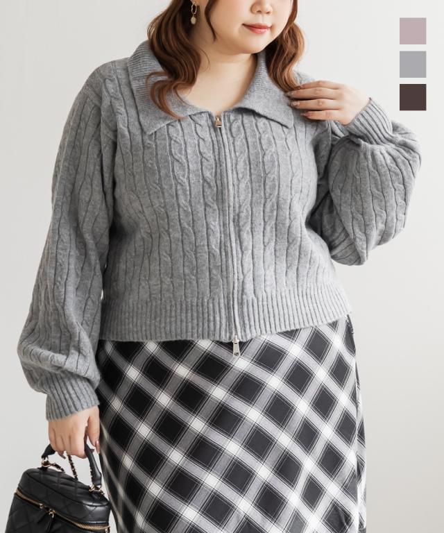 大きいサイズ/レディース/LL/3L/4L/CLETTEオリジナルケーブル編み襟付きジップニット