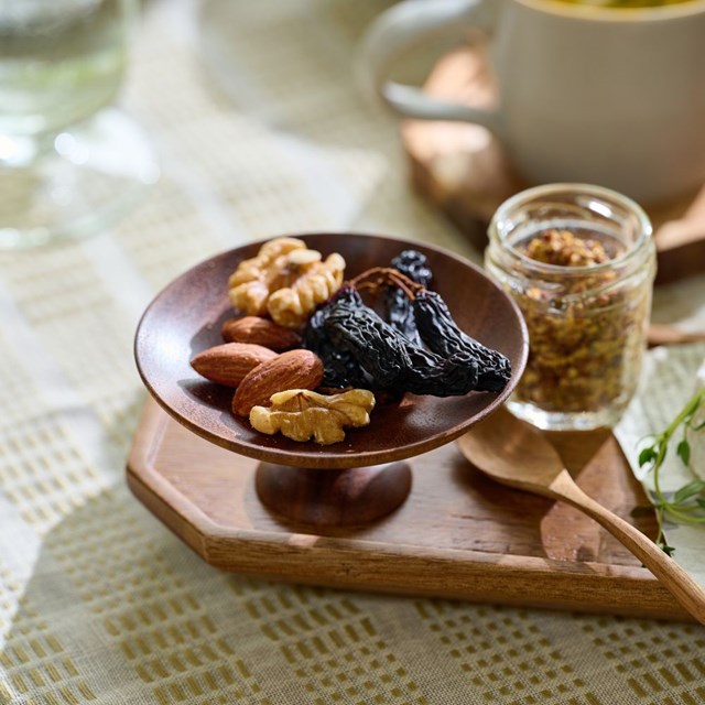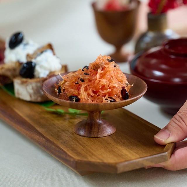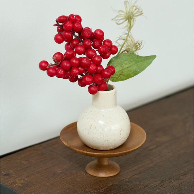 お正月のおせち料理やクリスマスの特別な一品を、ひときわ上品に引き立てる木製の脚付き豆皿です。 |