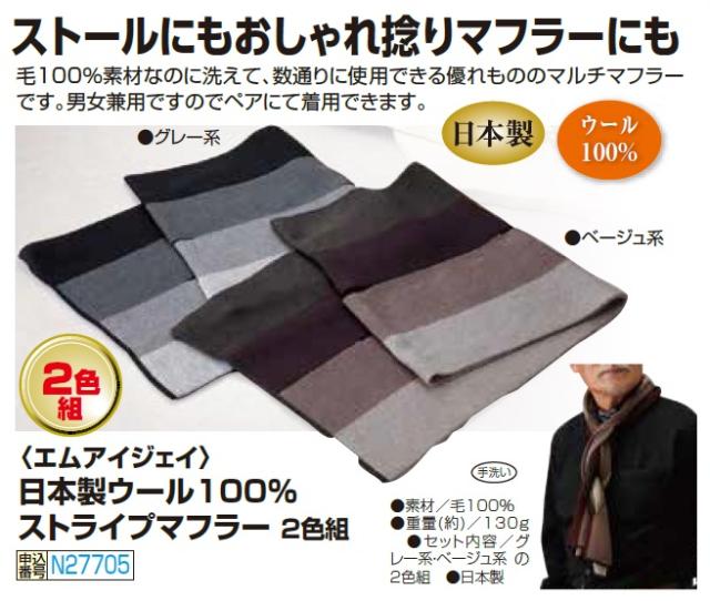 日本製 エムアイジェイ 日本製ウール100% ストライプマフラー 2色組 マフラー メンズ 紳士 シニア 男性 大人 襟巻き ストール フリンジ無し 毛 ウール グラデーション グレー ブラック ベージュ ブラウン 40代 50代 60代 70代 80代 父の日 お父さん 秋冬 sai p27705