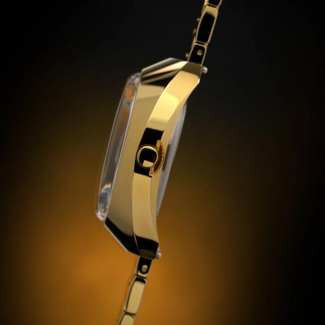 1972年に発表されたこのアーカイブクォーツウォッチ「Time Machine」は、70年代の大胆さを体現しています。39mmの再生ステンレススチール製トノーケースは、全面にポリッシュ仕上げが施され、力強い印象を与えます。印象的なタイガーアイダイアルの上に浮かぶ立体的なフローティングアワーマーカー、それにマッチしたポリッシュ仕上げの針、台形の日付表示窓、そして当時の雰囲気を再現したドーム型アクリルクリスタルなど、細部へのこだわりが随所に見られます。ポリッシュ仕上げの再生ステンレススチールから丁寧に作られた大胆な幾何学模様のブレスレットが、このノスタルジックな復刻デザインにモダンなエッジを添えています。