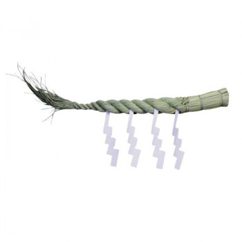 しめ縄は、そこが神聖な場所であることを示すために張られる縄のことです。内と外を区別し、神棚を不浄から隔てる役割を持つ神祭具です。しめ縄には紙垂または四手と呼ばれる紙片を挟み込みます。稲妻の形である紙垂は豊作を表し、邪なものを祓い、聖域を示しています。新たな年を迎える準備として、しめ縄は年末に交換される慣わしがあります。 生産国:台湾 素材・材質:青稲他 商品サイズ:長さ~約60cm、根元太さ約6cm 重量:約300g 付属品:紙垂4枚