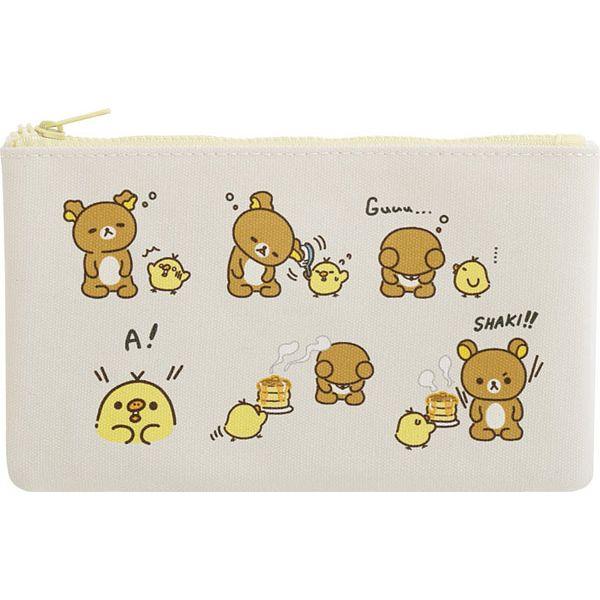 リラックマとキイロイトリのコミカルなやりとりが描かれた、癒し系フラットポーチ。