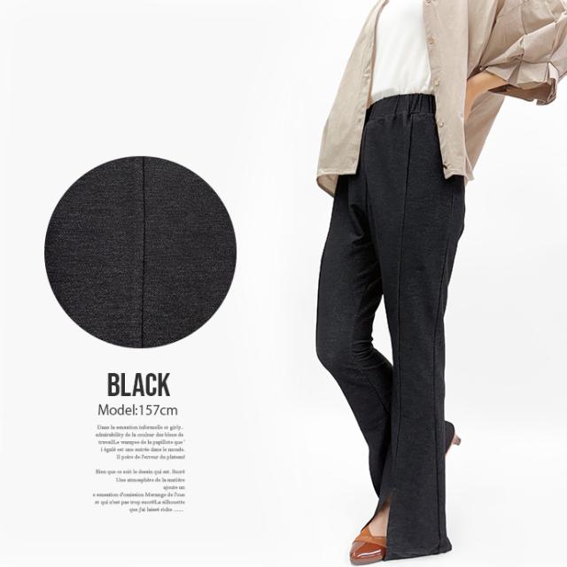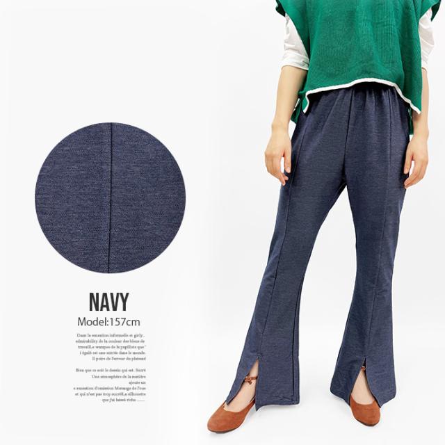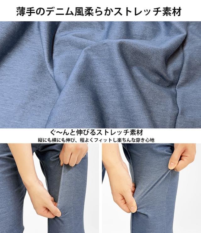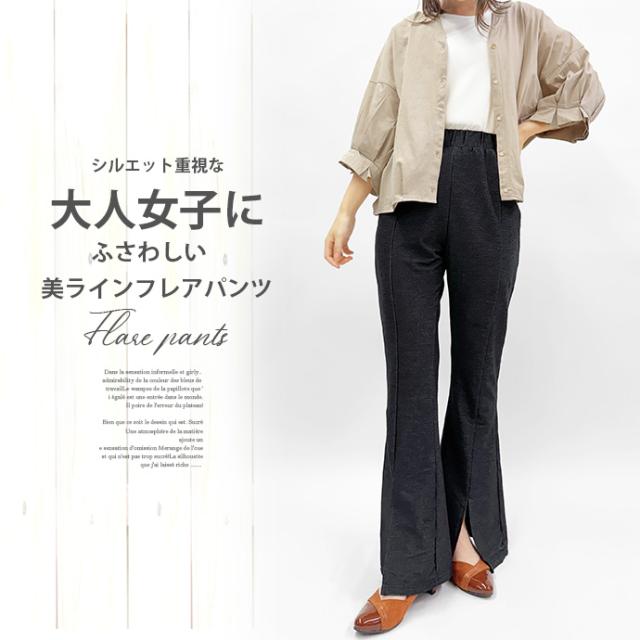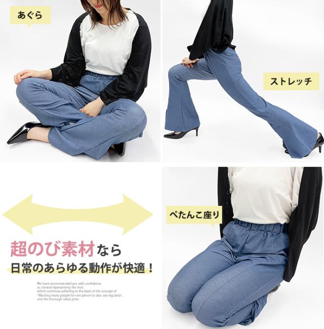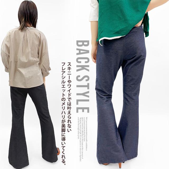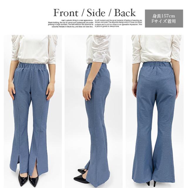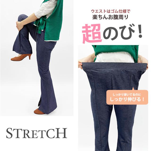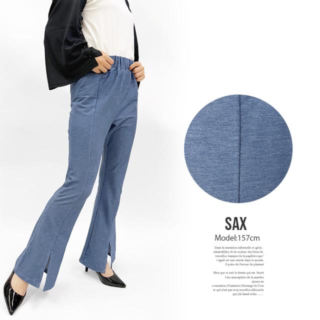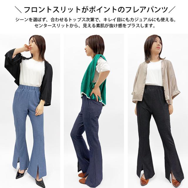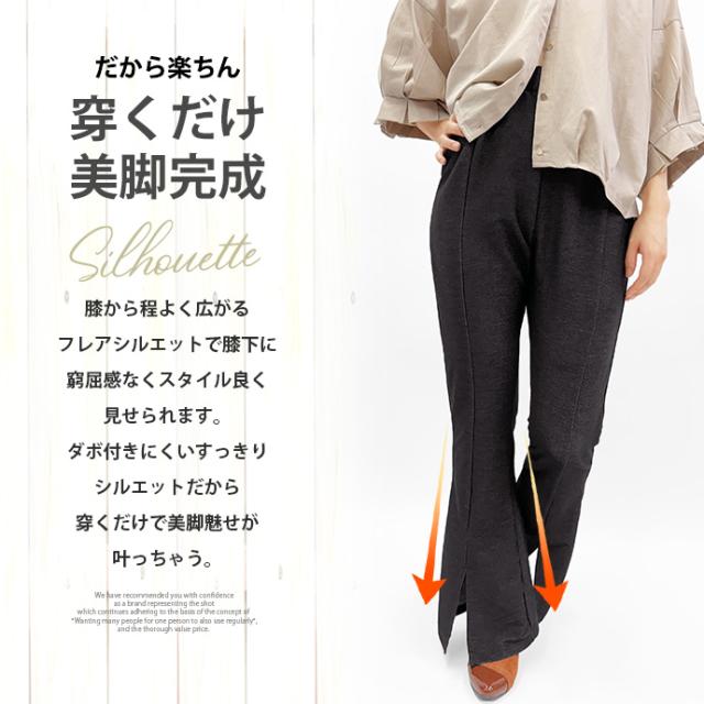 フレアパンツ レギンス パンツ センタースリット センタープレス 薄手 デニム風 ウエストゴム ストレッチ 伸縮性 ボトムス レディース 送料無料