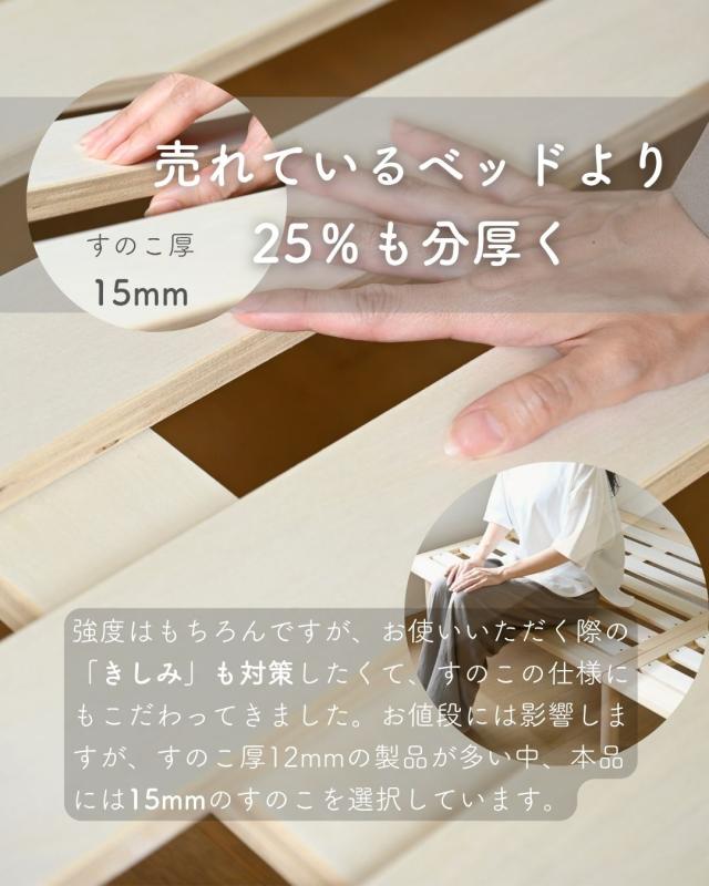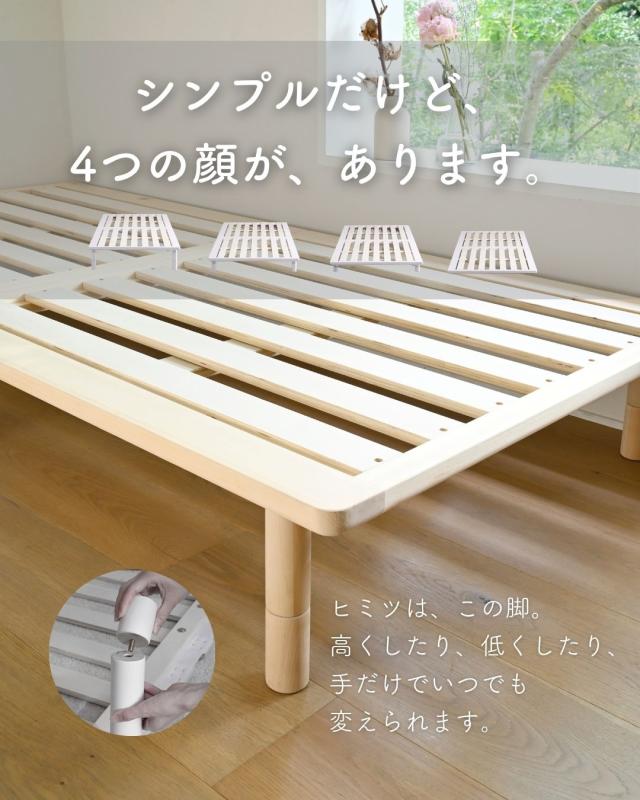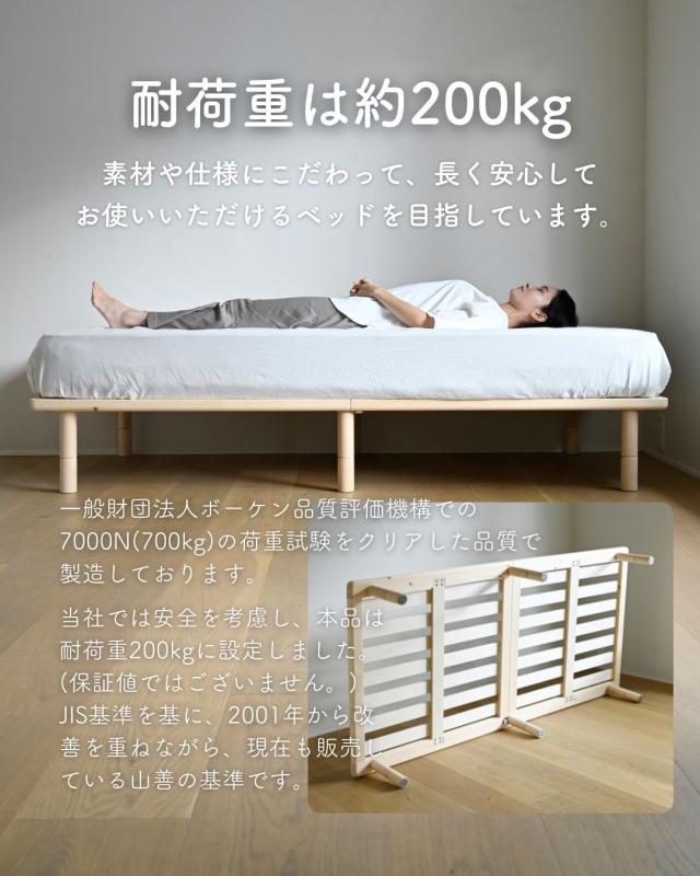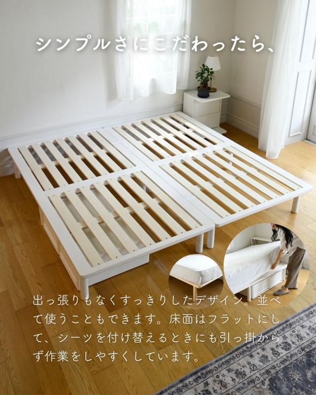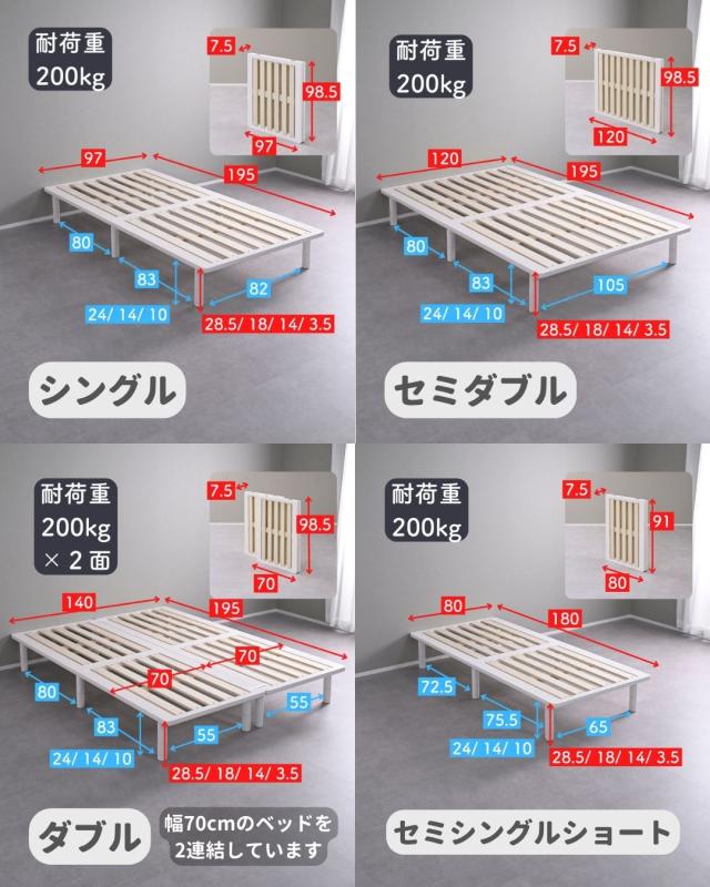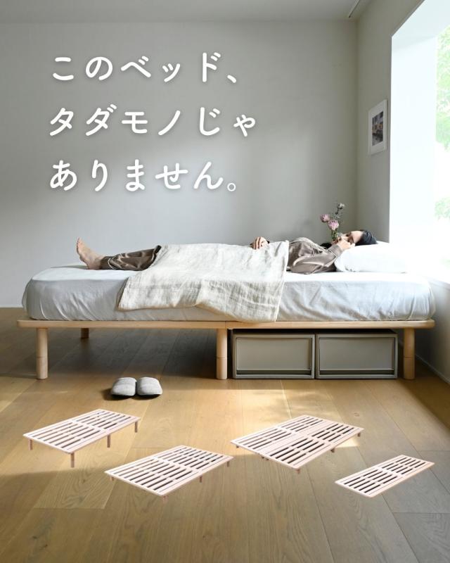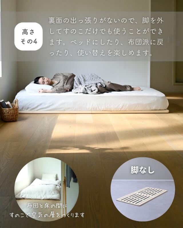 | 商品説明 | ●組み立てもバラすのもかんたんな天然木のベッドフレーム ●本体は組み立て不要、箱から出して脚をねじるだけ、素手だけで作業できる組み立て簡単仕様 ●いざというときは、たたんで厚み7.5cmで薄く収納可能 ※中央の金具は必ず上向きにしてください。自立はしません。 ●出っ張りのないヘッドレスタイプで、横に並べたりしてレイアウトできるシンプルさ ●脚の高さを、ネジるだけでいつでも4段階に変更可能 ●フレームは厚み35mmの重厚なパイン材で、面取り加工をしたやさしい設計 ●すのこには厚み15mmの積層材を使用し、きしみにくい安心の床面を追求 ●静止耐荷重:200kg(保証値ではございません。) ※本製品は7000N (700kg相当)の荷重試験をクリアした商品です。当社では安全を考慮し、耐荷重200kg(ダブルサイズは300kg)に設定しております。 ●傷防止のフェルト付き ●連結固定用の面ファスナー付属(2つ) ●床面高(本体高さ): 28.5、18、14、3.5cm ●ベッド下高さ:24、14、10cm ●長辺側ベッド下内寸幅: 80/83cm、SSSのみ72.5/75.5cm(※左右で幅が異なります) 頭/脚側ベッド下内寸幅: S/82 SD/105 D/55/ SSS 65cm |
