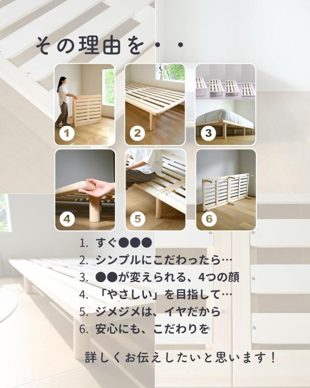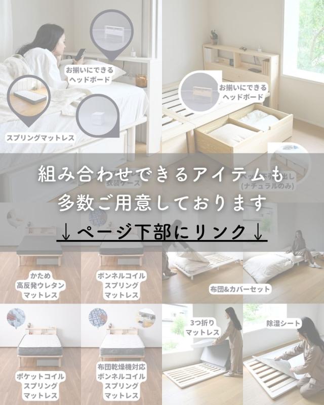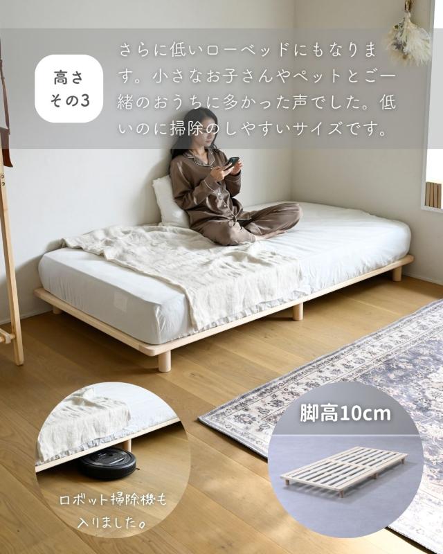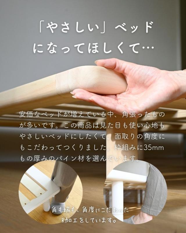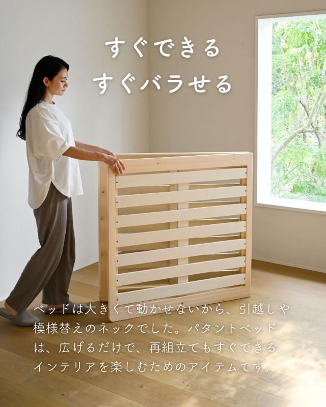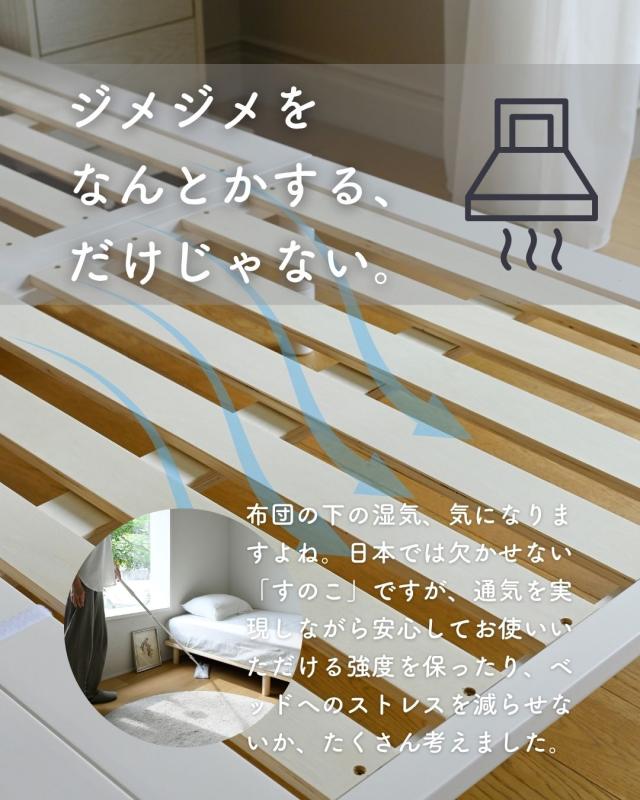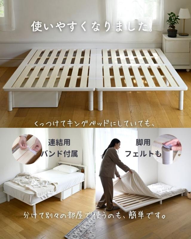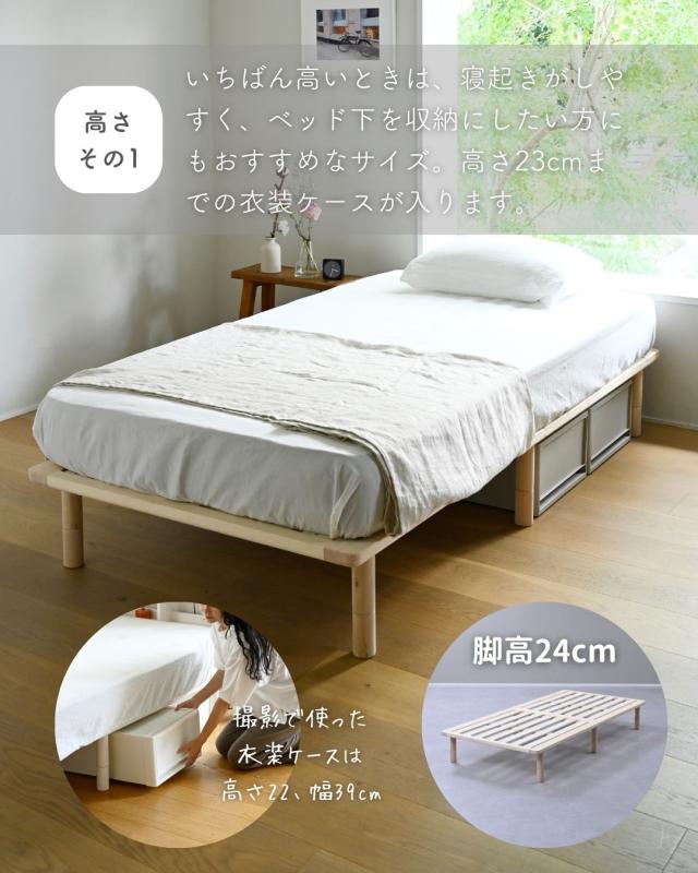| 商品説明 | ●組み立てもバラすのもかんたんな天然木のベッドフレーム ●本体は組み立て不要、箱から出して脚をねじるだけ、素手だけで作業できる組み立て簡単仕様 ●いざというときは、たたんで厚み7.5cmで薄く収納可能 ※中央の金具は必ず上向きにしてください。自立はしません。 ●出っ張りのないヘッドレスタイプで、横に並べたりしてレイアウトできるシンプルさ ●脚の高さを、ネジるだけでいつでも4段階に変更可能 ●フレームは厚み35mmの重厚なパイン材で、面取り加工をしたやさしい設計 ●すのこには厚み15mmの積層材を使用し、きしみにくい安心の床面を追求 ●静止耐荷重:200kg(保証値ではございません。) ※本製品は7000N (700kg相当)の荷重試験をクリアした商品です。当社では安全を考慮し、耐荷重200kg(ダブルサイズは300kg)に設定しております。 ●傷防止のフェルト付き ●連結固定用の面ファスナー付属(2つ) ●床面高(本体高さ): 28.5、18、14、3.5cm ●ベッド下高さ:24、14、10cm ●長辺側ベッド下内寸幅: 80/83cm、SSSのみ72.5/75.5cm(※左右で幅が異なります) 頭/脚側ベッド下内寸幅: S/82 SD/105 D/55/ SSS 65cm |