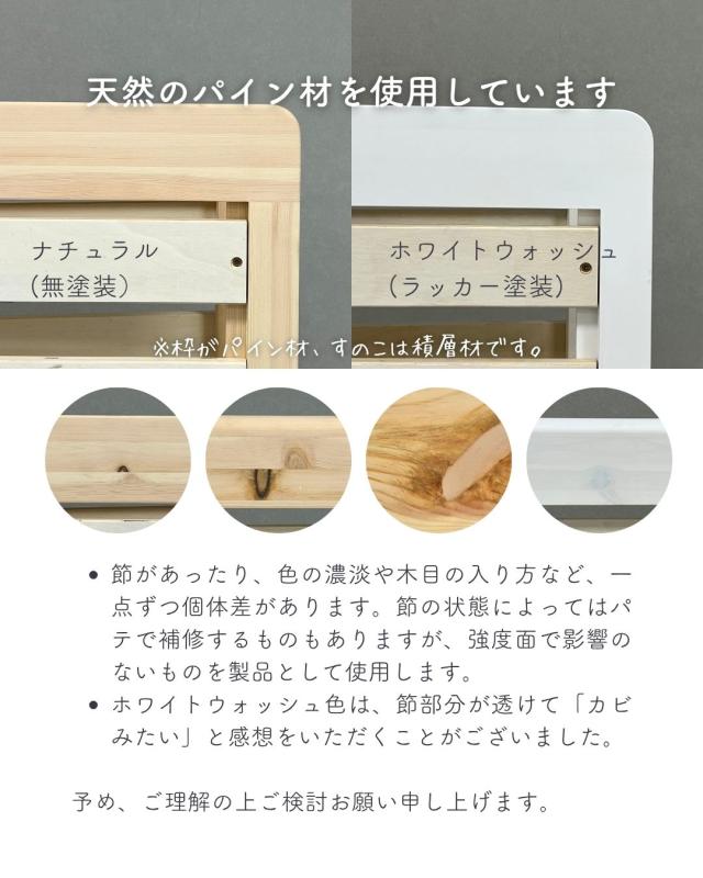 | 材質 | フレーム: 天然木パイン(ラッカー塗装) フレーム: 天然木樺(ラッカー塗装) 床面: 積層材(無塗装) |