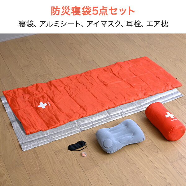 | 商品説明 | ●サッと使える!就寝時に必要な5点セット ●セット内容:寝袋、ポンプ付きエア枕、アイマスク、耳栓(ケース付き)、アルミシート ●防災士監修 ●寝袋は収納袋付き ●寝袋は丸洗い可能 ※中性洗剤を使い手洗いで優しく押し洗いし、全体が乾くまでしっかりと乾燥させてください ●エア枕はポンプ付きで空気の充填が簡単 ●アルミシートは下からの熱さや冷たさをやわらげます。また着替えの際の目隠しや避難所での仕切りなどにも使用できます |