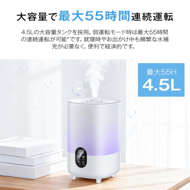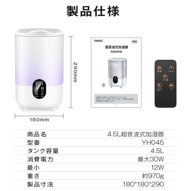 マイナスイオン 4.5L 大容量 超音波式 加湿器 卓上 オフィス 加湿器 おしゃれ 加湿器 お手入れ簡単 加湿機 リモコン付き ギフト プレゼント