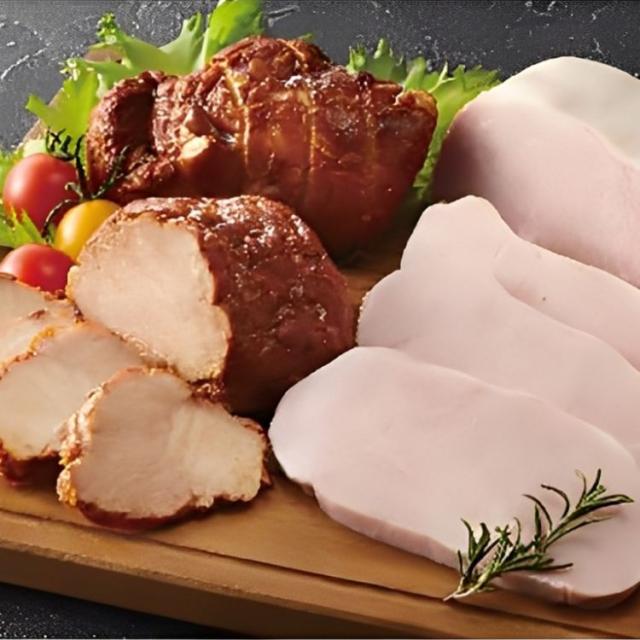 風味豊かで味わい深いホワイトタイプのロースハムと、香ばしく、しっとりとした食感の焼豚のセットです。