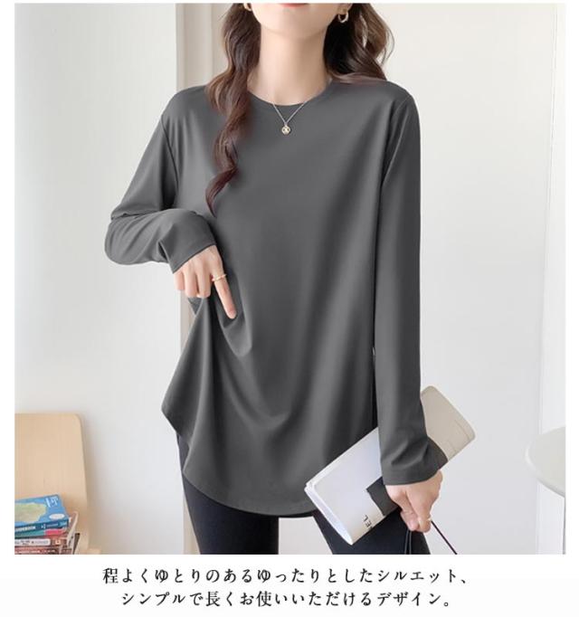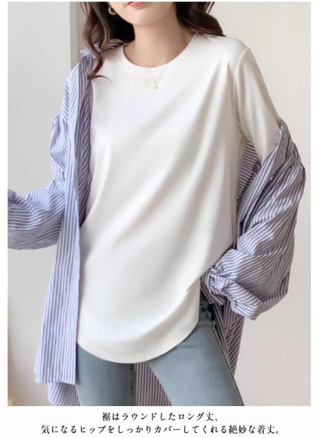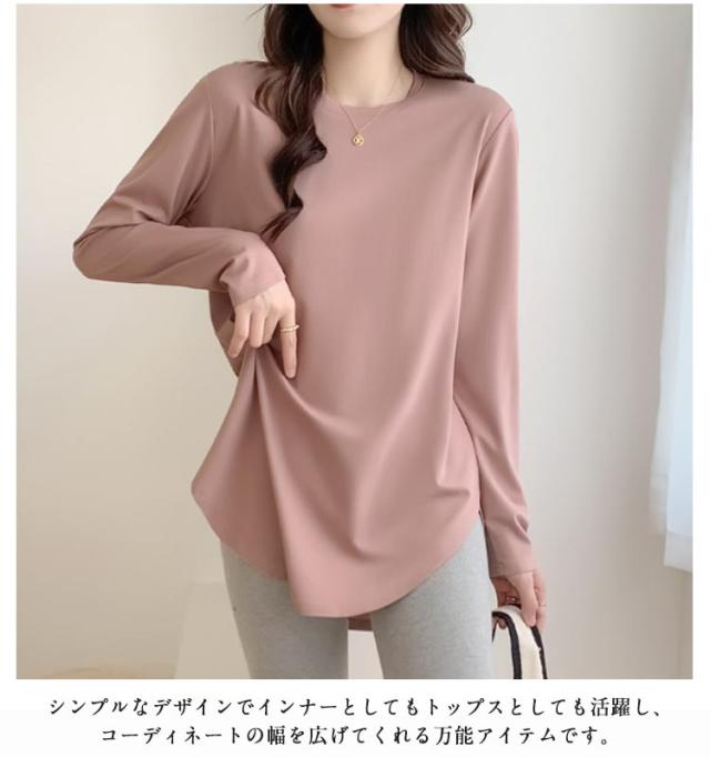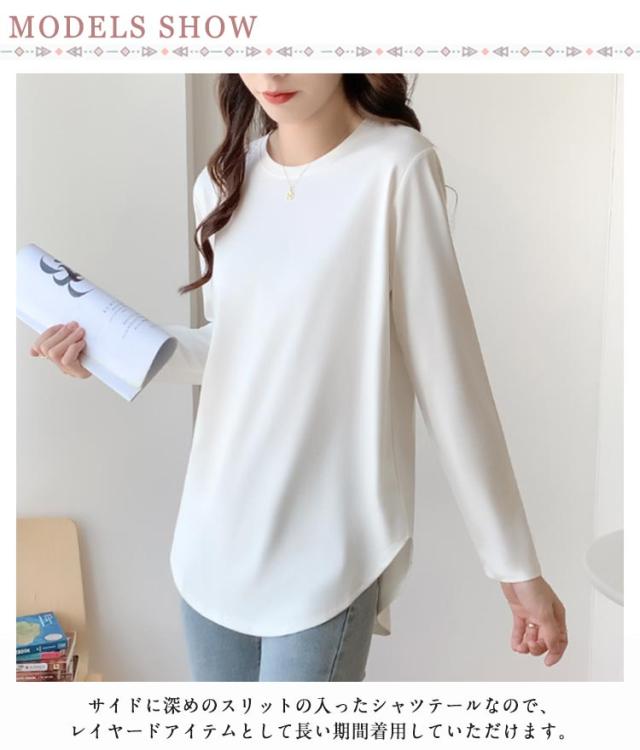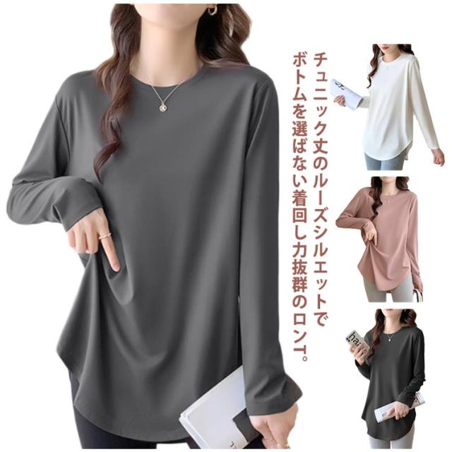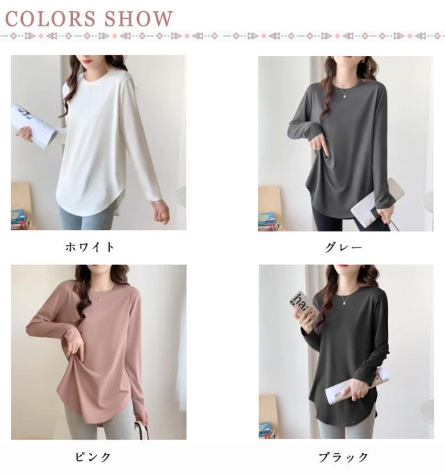 レディース ロングtシャツ 長袖 ロンt 春 サイドスリット 長袖 おしゃれ ラウンドヘム クルーネック 大きいサイズ ラウンドカット カットソー 秋 薄手 チュニック丈 インナー ゆったり お尻が隠れる 秋物 春服 冬 無地 シンプル カジュアル 黒 白 ピンク
