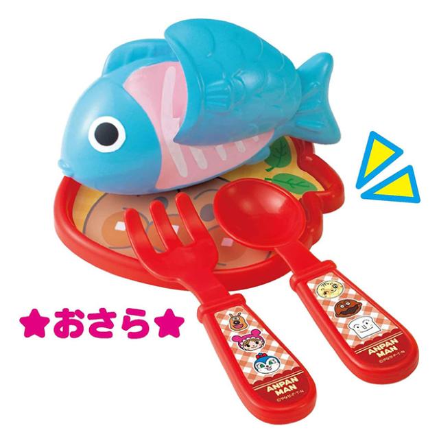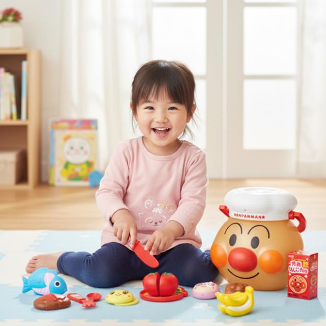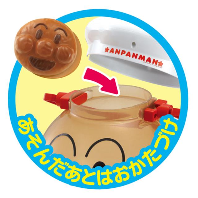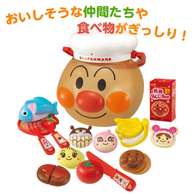 コック帽をかぶったアンパンマンのケースにおままごとアイテムがいっぱい!