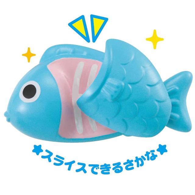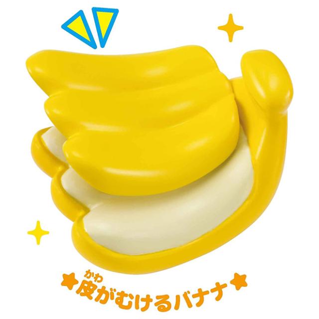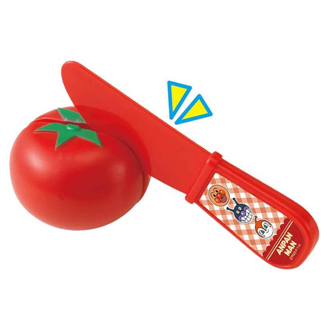 トントン切って遊べるアンパンマンとメロンパンナちゃんのパンにハンバーグとトマト、お魚はスライスでき、バナナは皮がむけます。