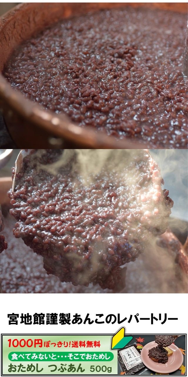 宮地館では小豆、砂糖、塩以外は入れず真剣にあんこに向き合い、無添加でおいしいつぶあんを手造りで丹精込めて造っております。