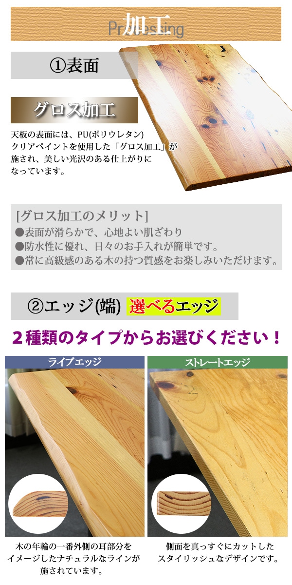 | 梱包サイズ(2個口) | 天板[180cm]: 「ライブエッジ」 約W 185×約D 84×約H 6(cm)/約40kg(オーク) 「ストレートエッジ」 約W 185×約D 84×約H 6(cm)/約40kg(オーク) 脚:約W 39.5×約D 78×約H 10(cm)/約15.2kg |