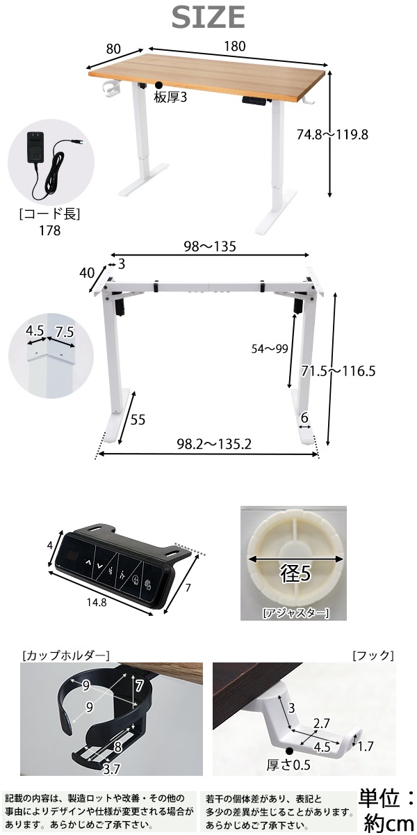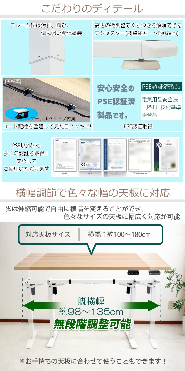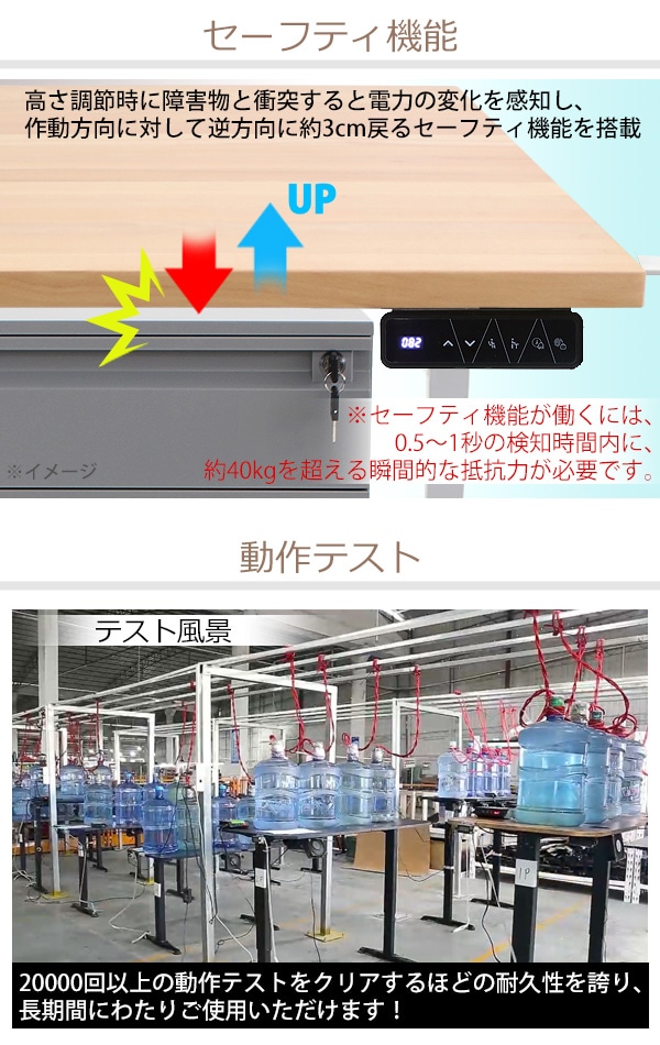 ■生活のシーンに合わせて使える電動昇降デスクです。 ■電動モーター式で、体格や作業に合わせて天板の高さをスムーズに調整出来ます。 ■横幅調整も可能で、色々な幅の天板に対応可能! ■昇降時の音が気にならない静音設計! ■スチール製のしっかりした本体ですが、軽量設計! ■破損やケガの予防のためのセーフティ機能付き!昇降時、障害物と衝突すると電力の変化を感知し、作動方向に対し、逆方向に約3cm戻ります。 ■耐荷重: 「ライブエッジ」 [180cm]動荷重:約64kg/静荷重:約144kg(オーク) 「ストレートエッジ」 [180cm]動荷重:約64kg/静荷重:約144kg(オーク) ※各サイズの天板が載った場合のデスク上に設置可能な荷物の総重量です。 【天板】 ■材質:オーク(無垢材)(グロス加工) ■重量: 「ライブエッジ」 [180cm]約36kg(オーク) 「ストレートエッジ」 [180cm]約36kg(オーク) 【脚部】 ■材質:スチール(脚部フレーム)、PP[ポリプロピレン](アジャスター) ■重量:約14kg ■アジャスター付きです。 ■昇降スピード:約1.5cm/秒(荷無しの時) ■動荷重:約100kg(脚部のみ) ■静荷重:約180kg(脚部のみ) ※天板の重量によって、デスク上に設置可能な荷物の総重量は変わります。ご注意ください。 ■付属品:5mm六角棒レンチ×1、天板取り付け用ネジ、ケーブルクリップ×1、電源アダプター×1、日本語説明書