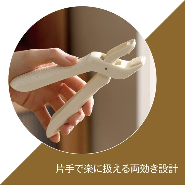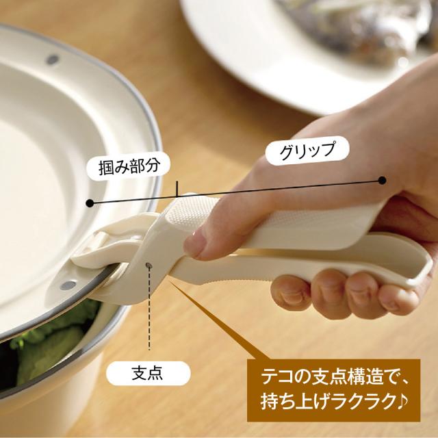 テコの支点構造で力が伝わりやすく、火傷リスクを軽減します。先端は器を傷つけにくい耐熱シリコン仕様。