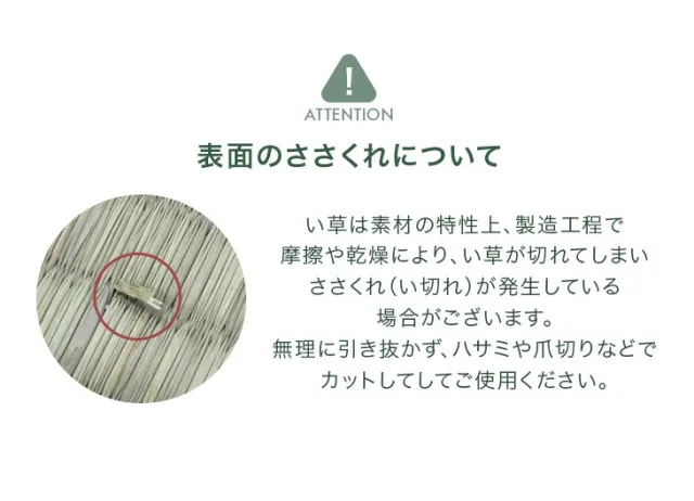 ※い草は植物で自然素材のため、摩擦や乾燥などにより、い草が飛び出すことがあります。引っ張らずに爪切りやハサミなどで短くカットしてください。